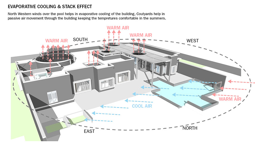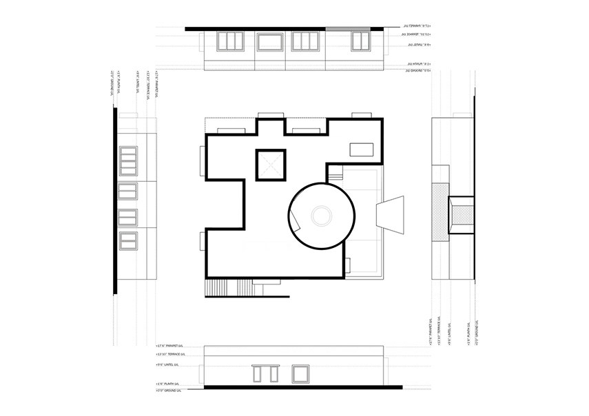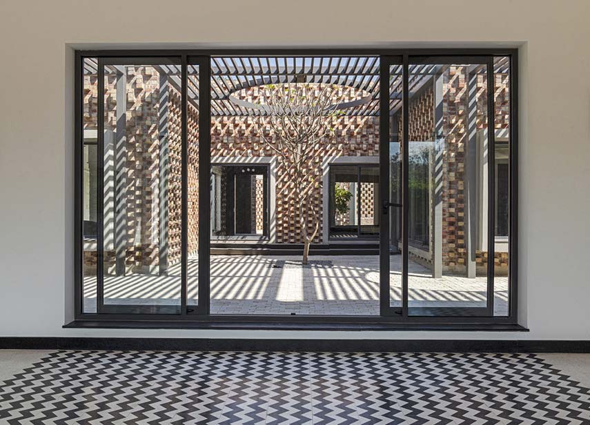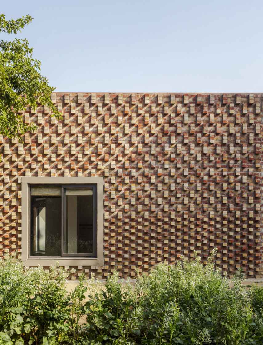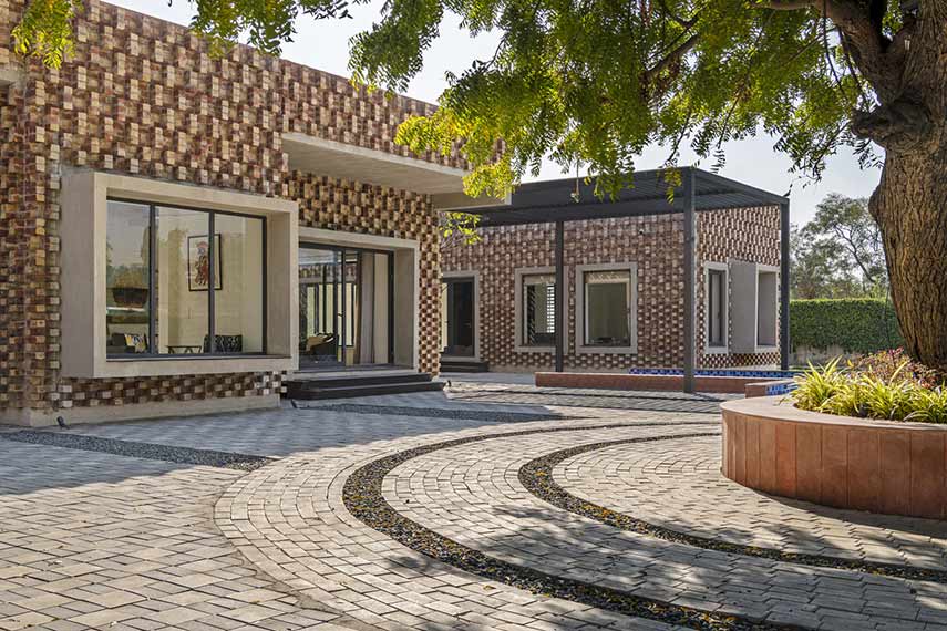 The house designed by RLDA Architects occupies the southern end of a plot measuring 6780m². This placement was determined by considering the topography of the land, the location of an existing tree, and the presence of a previously built driveway along the eastern boundary. The entire project consists of four structures, primarily constructed from brick: a circular guard room, a cuboidal pump room and two residential blocks
