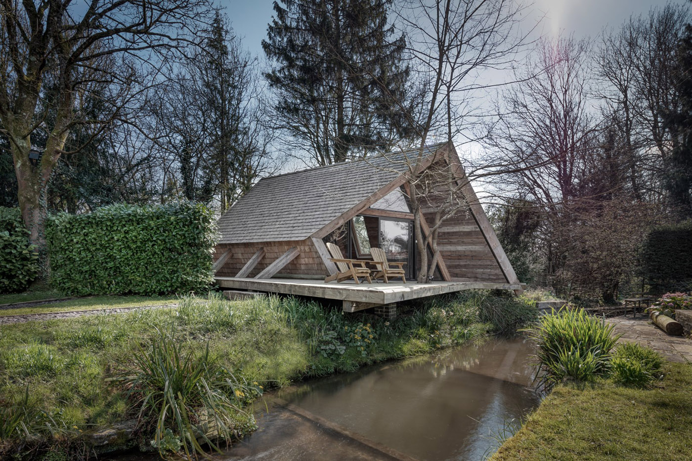 The Climber’s Cabin is one of the architecture projects by the award-winning AR Design Studio in Winchester and is designed to be almost entirely self-built by the client. For this reason, specialized works are kept to a minimum, using simple construction methods and sustainable materials sourced locally. The cabin is built around four A-Frame trusses and sits on simple brick foundations. Scaffold boards form the interior finishes, while locally sourced cedar shingles clad the exterior.