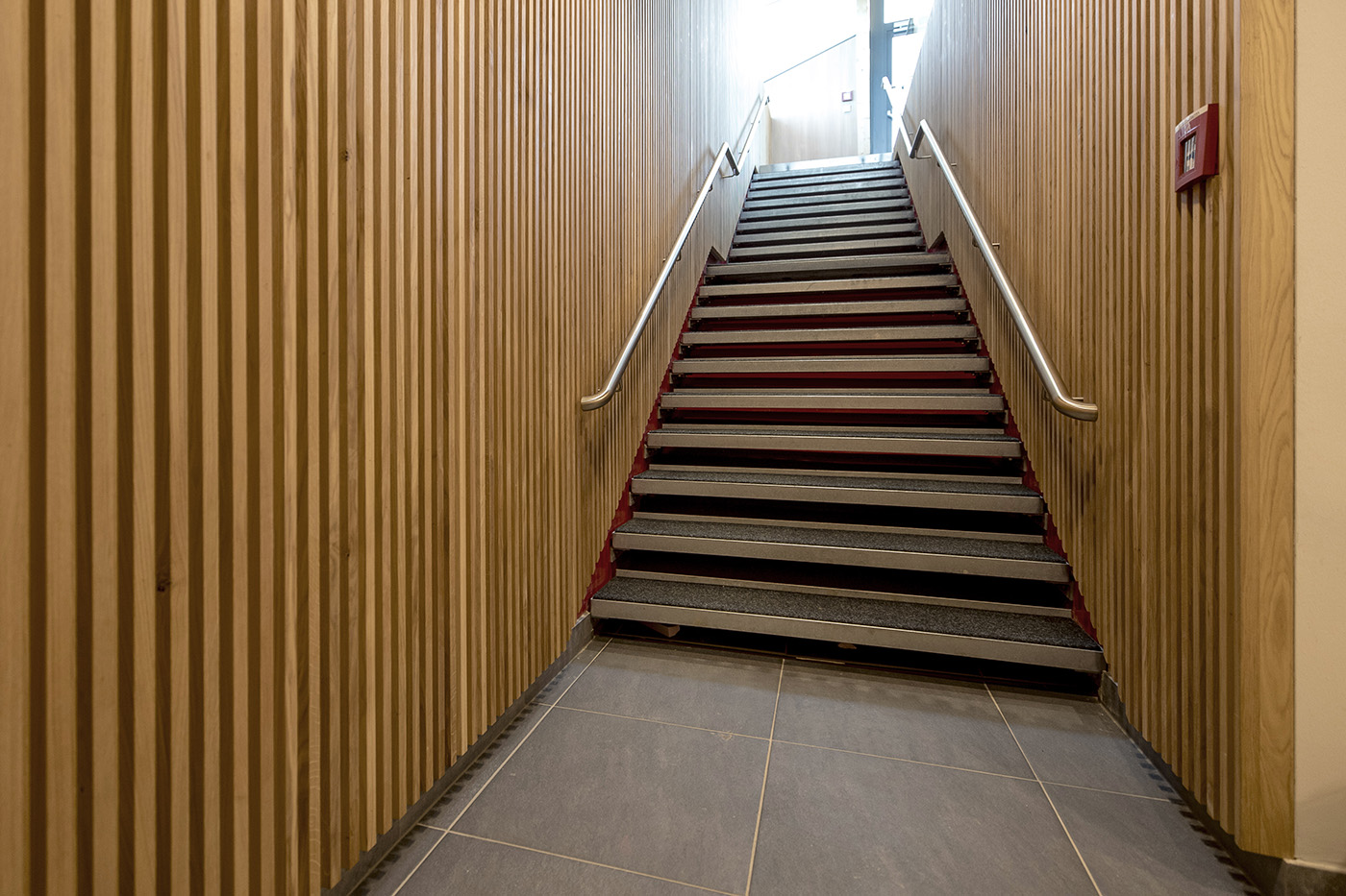 The entire interior space is filled with suspended lamps made of compressed felt which convey the idea of a swarm of birds flying through the building. These in combination with perforated wooden ceiling panels create a fantastic acoustic experience throughout the restaurant