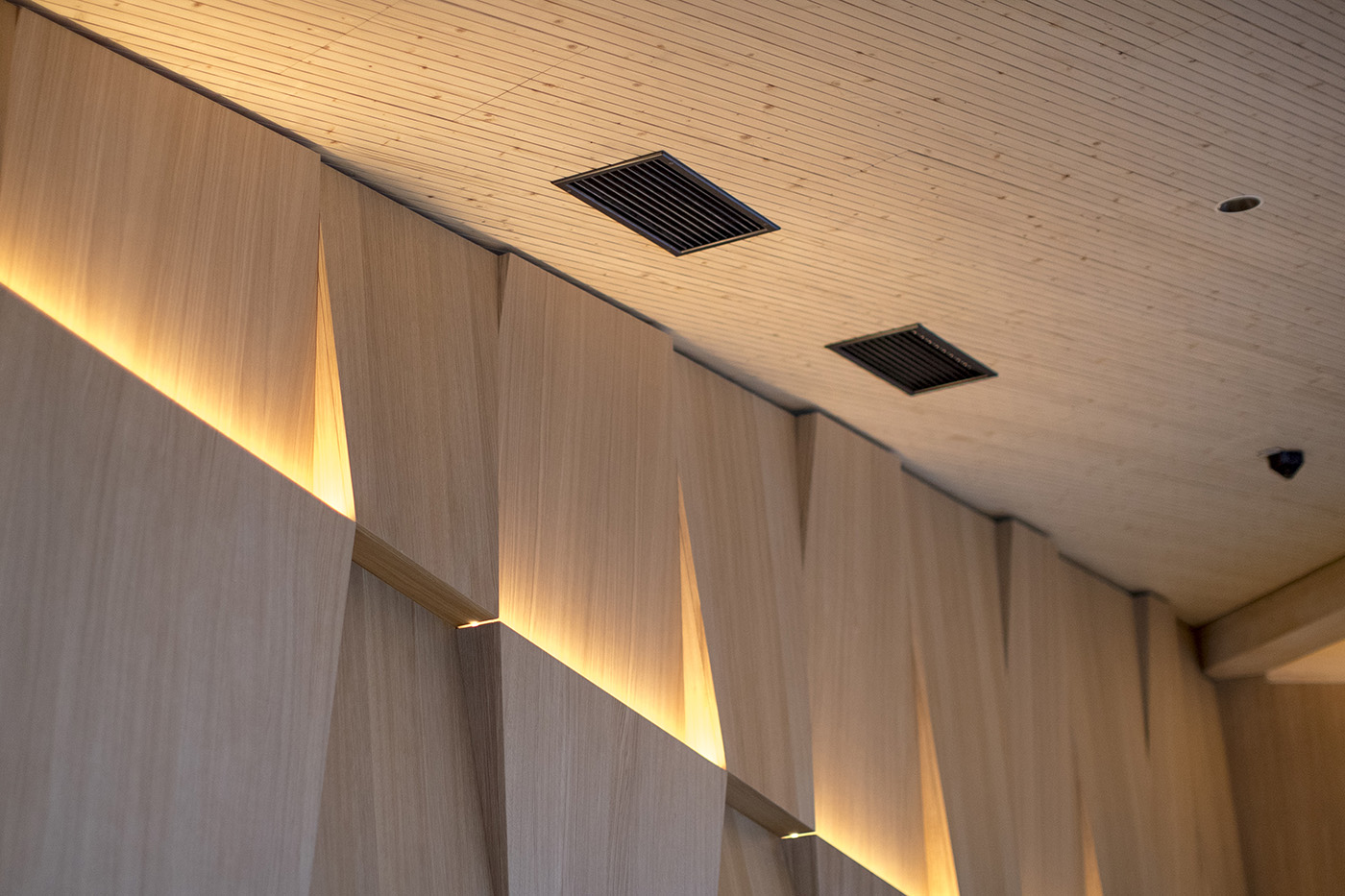 Large CLT beams, arranged in the shape of a star, define the restaurant space. The triangular areas between the beams are filled with perforated wood acoustic panels, which act as a false ceiling where the ventilation and electrical systems are concealed