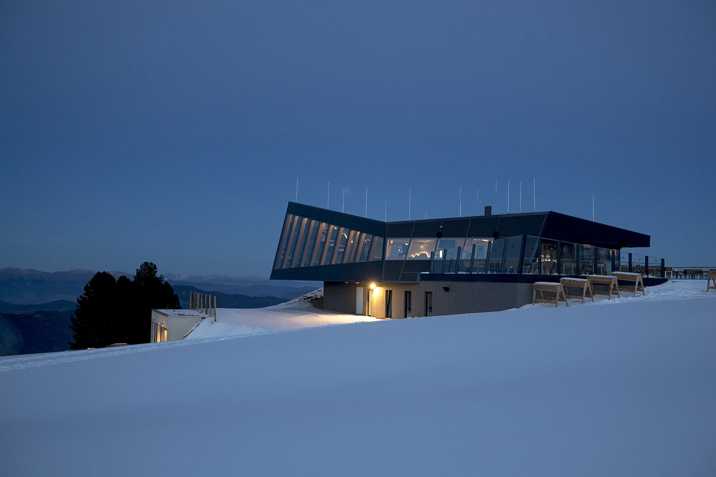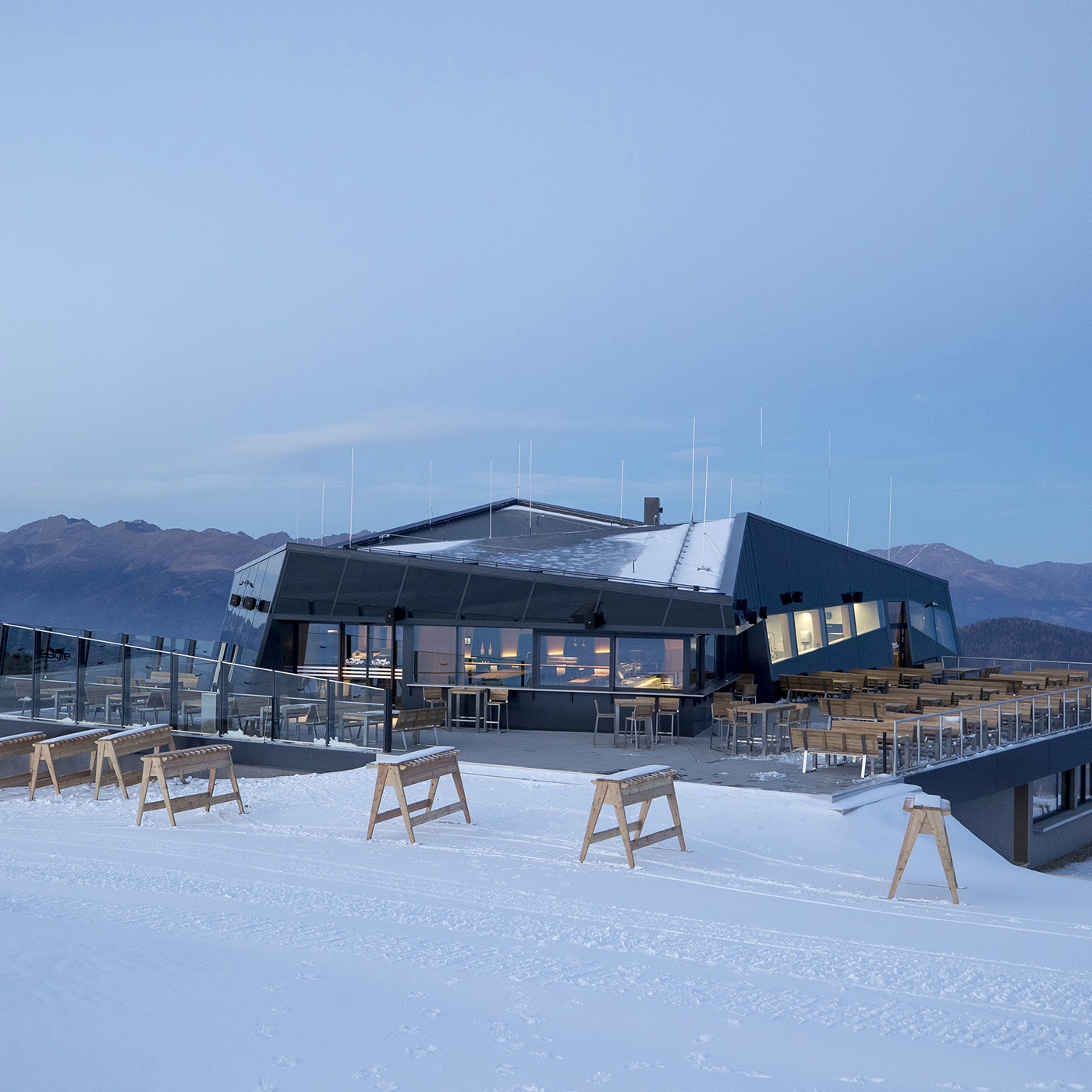 The interior of the restaurant is completely clad in wood and stone and attempts to adapt to the stereotype of mountain huts but interpreted in a modern and contemporary way. The CLT superstructure is covered with glass panels of up to 6 metres high, offering spectacular views of the ski slopes and mountain ranges