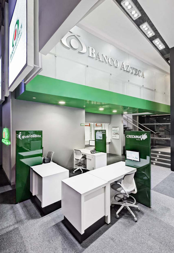 The usoarquitectura team, thanks to its experience in commercial interior design projects, designs an attractive exhibition space where Elektra, Banco Azteca, Italika, and TotalPlay offer their customers a memorable and highly efficient experience. To this end, the service modules, box fronts, and shelving have been exclusively designed for this project