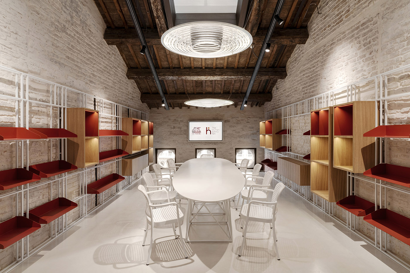 The Migliore+Servetto studio, internationally recognized for excellence in interior design and exhibition setups, as well as in the design of communication spaces, has been chosen to carry out the new headquarters for The Human Safety Net. The project is divided into four distinct areas: an exhibition path with an innovative concept that offers visitors an immersive experience of the Generali Group Foundation and its activities; a cafeteria; a co-working area with functional zones dedicated to the Foundation's activities; and finally, the event rooms that flank the auditorium