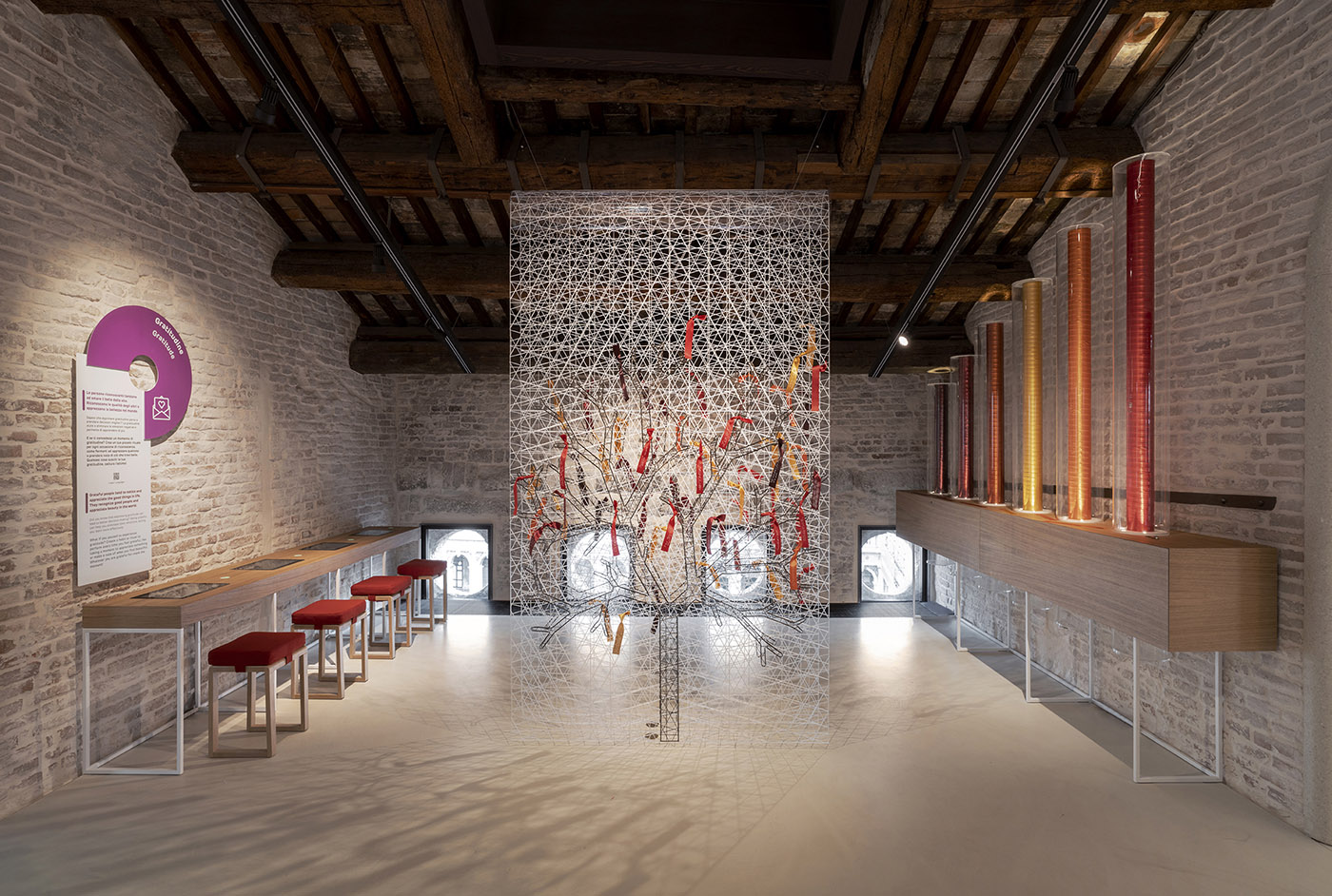 Three recurring symbols connect the entire, vast and varied project: the table, the nest, and the mirror. Symbol of meeting and dialogue, the table is present in the interactive installations and in the social spaces, made with wooden, metal or copper pipes and glass. The nest is a symbol of hospitality and ties, and is reflected in the shelf structures present in the social and work spaces. Lastly, the mirror, which boasts a centuries-old tradition in Venice and recurs in the café furniture and various installations, is an allegory of challenging oneself, of reflection and consciousness