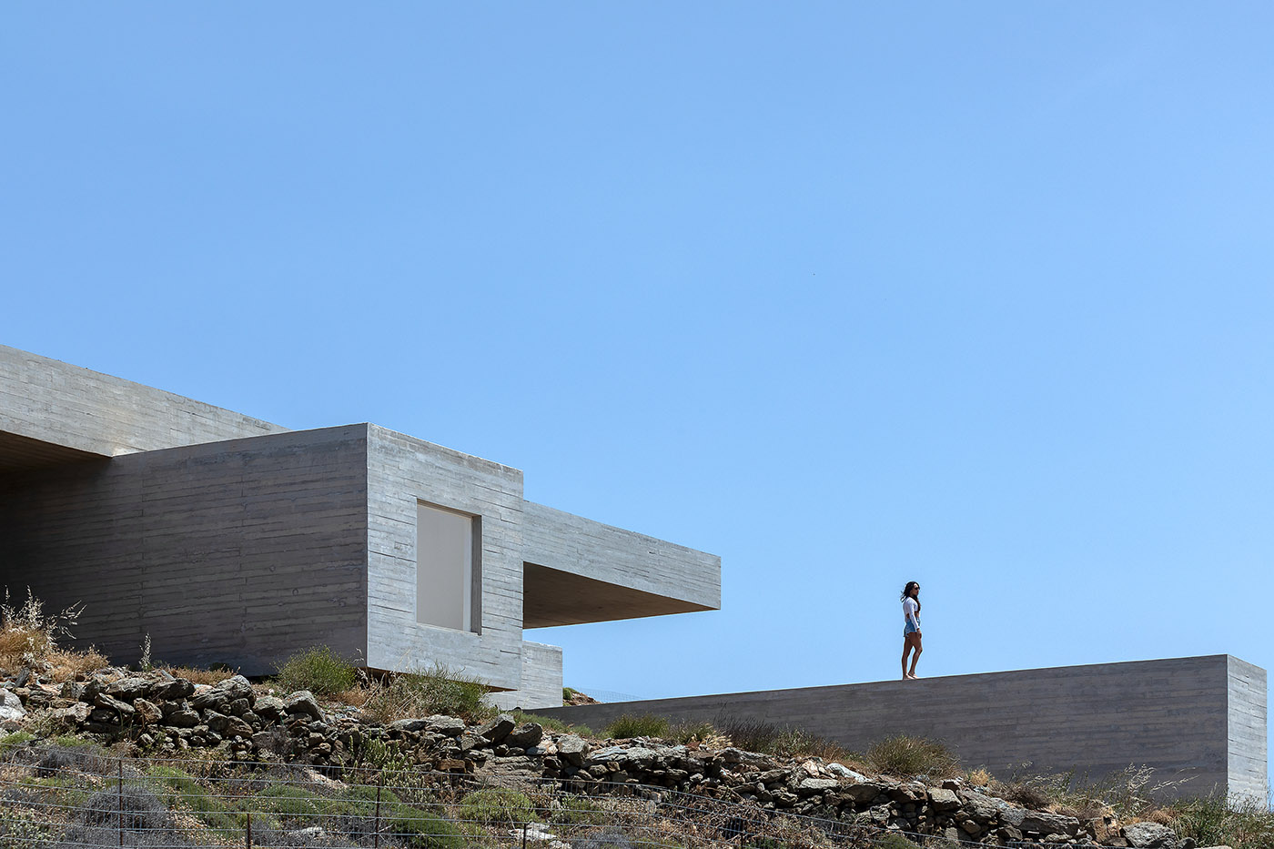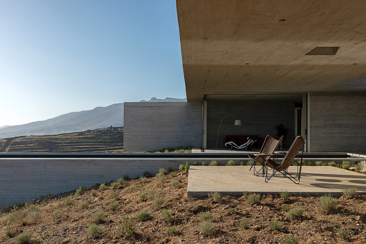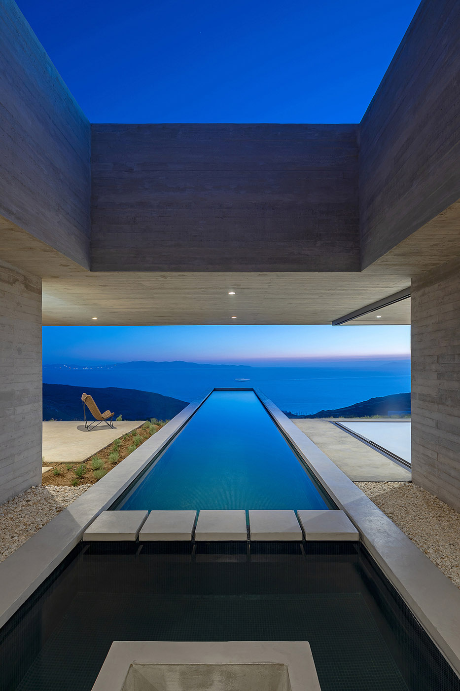 The linear volume of the swimming pool that emerges from the slope creates a tension starting from the building and projects towards the horizon. The palette of colors used blends with the landscape, camouflaging with it. However, the building always maintains a dynamic force. The occupant is invited to experience a strong bond with nature and is immersed in the scenery of Tinos and its landscape