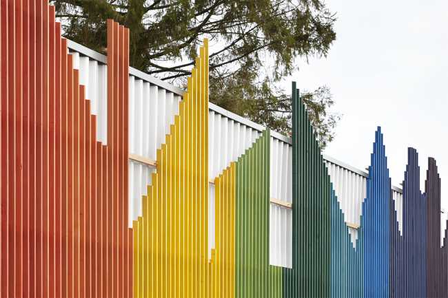 Each class is assigned a title of animal and each window and door is matched with a color, to symbolize its part in this "underground village" that is created inside the wooden structure. To keep costs down, plywood was used indoors, while a screen was created externally using colored stained wood, playfully evoking the existing roofline of the school's main hall, linking the building to its surroundings.
