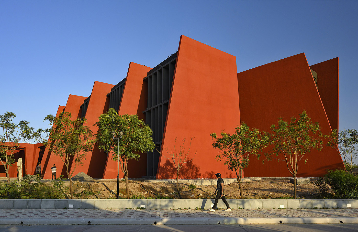 High school in India. Trapezoidal volumes design the architecture between contrasting lights and shadows