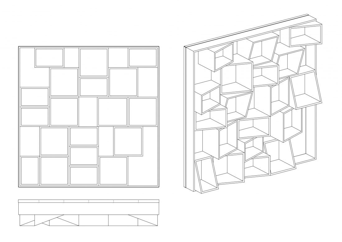 Custom furniture was also designed for the house: the custom modular shelf system is inspired by a conceptual model developed during the design of the house, and is mounted in a brass wall frame to house books and artefacts in the living room