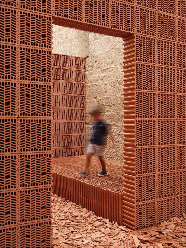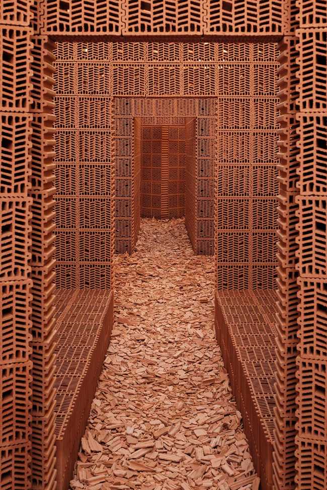 The floor, covered with fragments of discarded bricks, gives the space a material continuity, slowing the passage of those who traverse it and offering a pleasant experience away from the hustle and bustle of the city