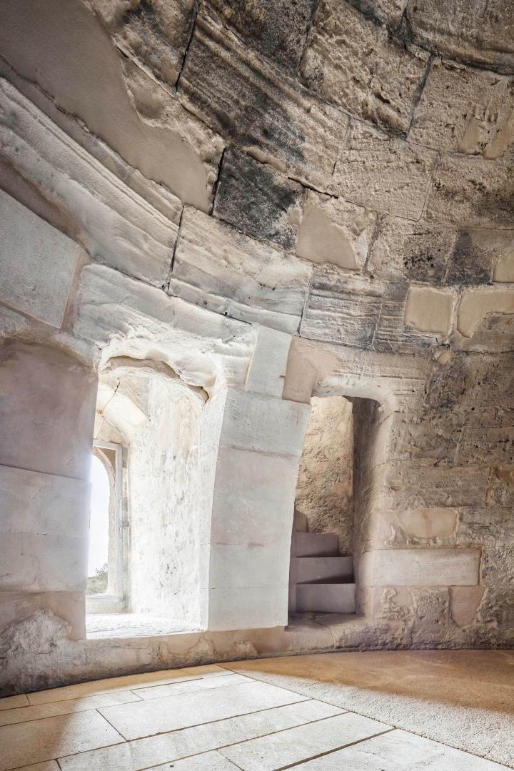The platform is accessible by a spiral staircase. In order to ensure the overall integrity of the monument, as well as its character and identity, the project completed in 2016 was very selective and timely, involving only those parts that most endangered the lifespan of the building. To this end, preference was given to the limited range of original materials and the chronological and constructive authenticity of the implementation. Taking advantage of the existing hole in the eastern part of the ground floor, a door was installed, which makes this tower the only one on the entire island that can be accessed by visitors