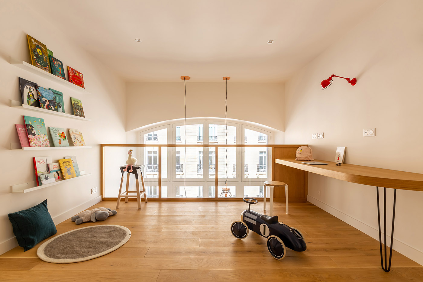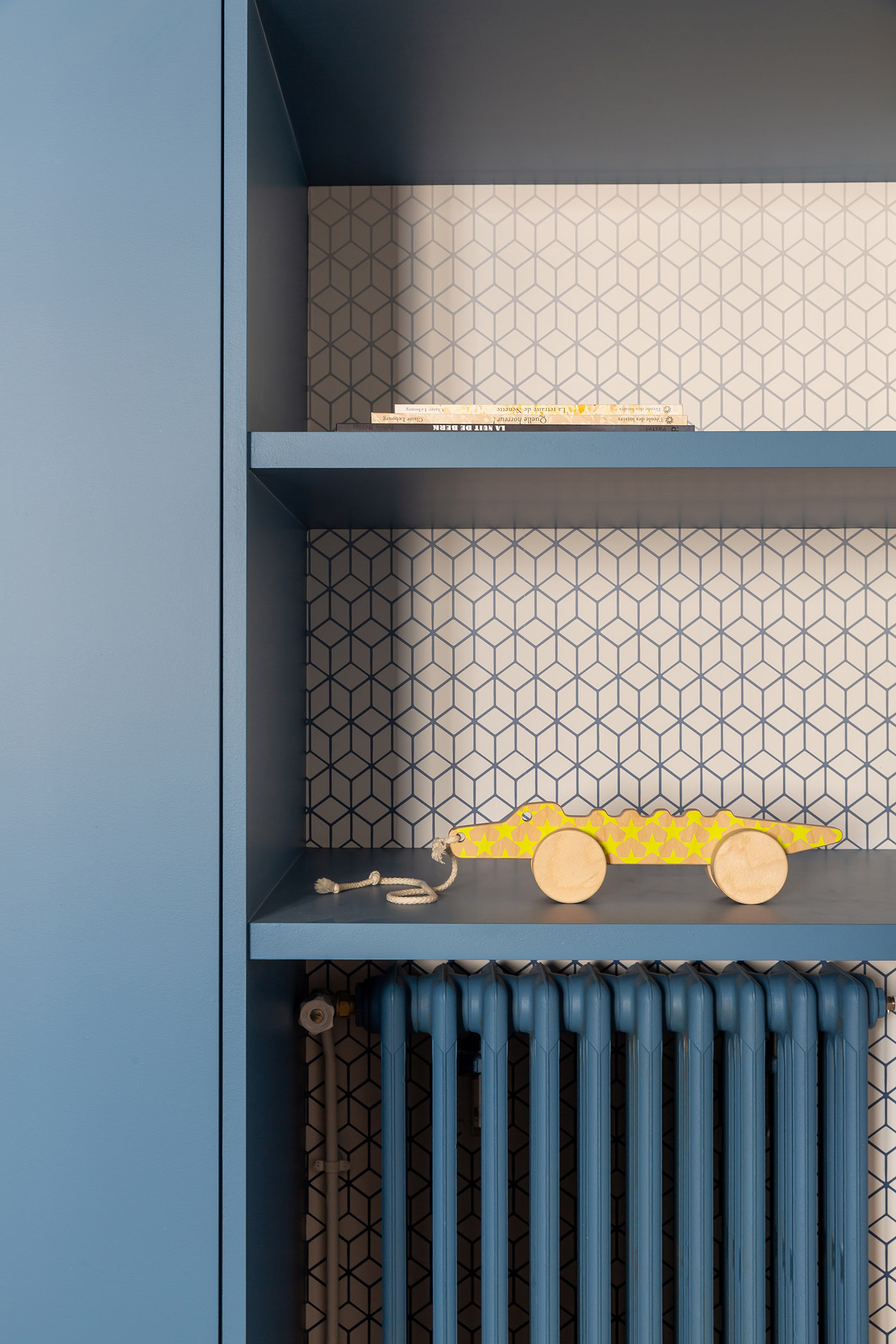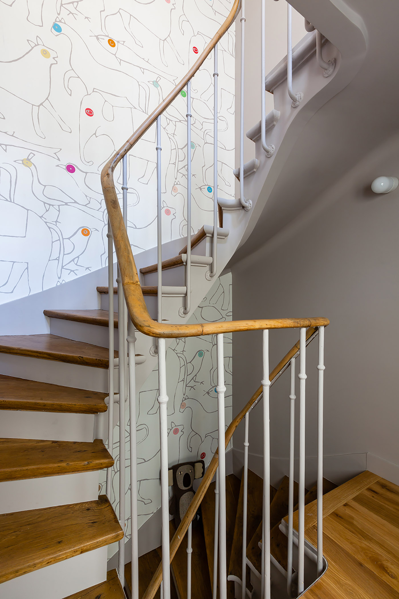 The connection between the different spaces is created by the custom oak and blue compositions found in the kitchen, living room bookcase and entrance hall. On the upper floors, each room has its own identity but remains in harmony with the whole thanks to meticulous color and decorative choices