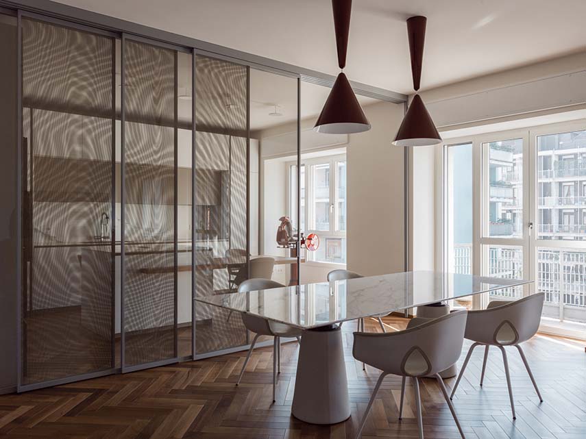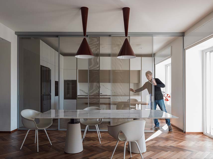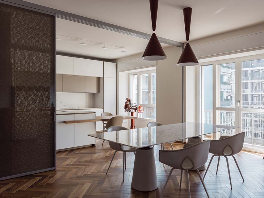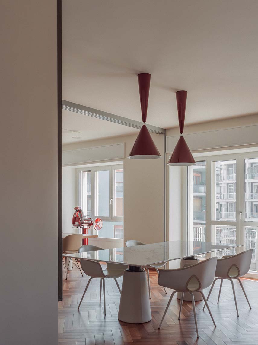 The apartment subject to the renovation, titled "Two Diabolos" in honor of the two lamps designed by Achille Castiglioni that aesthetically dominate the dining area, is located within a building designed by Gio Ponti, in Milan