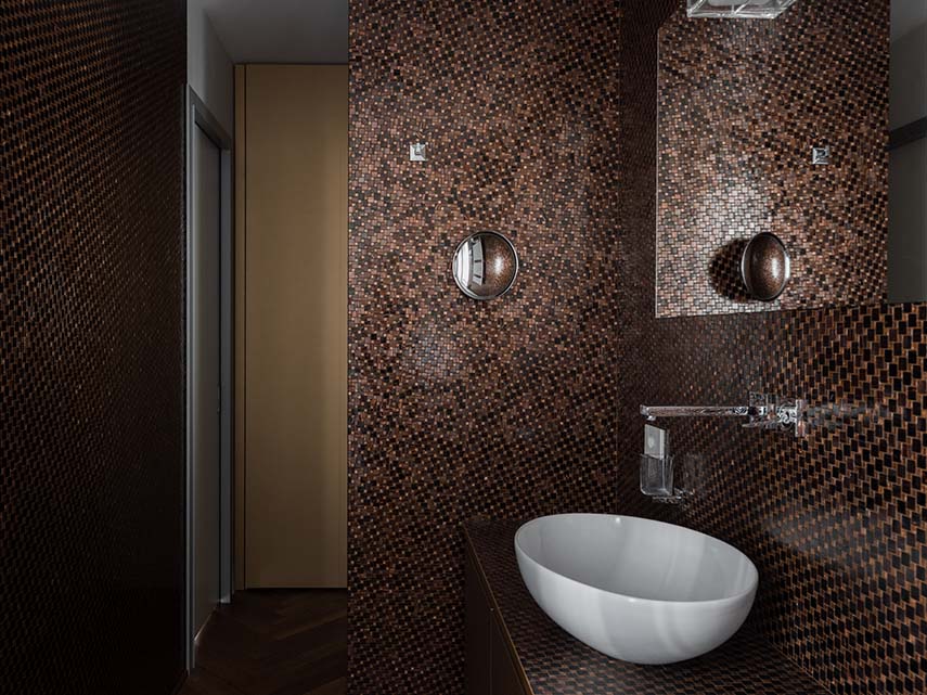 The design studio Arkispazio, led by Paolo Balzanelli and tasked with the Due Diabolos interior project, takes advantage of the central location of the entrance to optimally redistribute the apartment layout. The east side is dedicated to the sleeping area and accompanying amenities, leaving the west-facing portion, with its large windows overlooking the main balcony, for a spacious and bright living room with a kitchen
