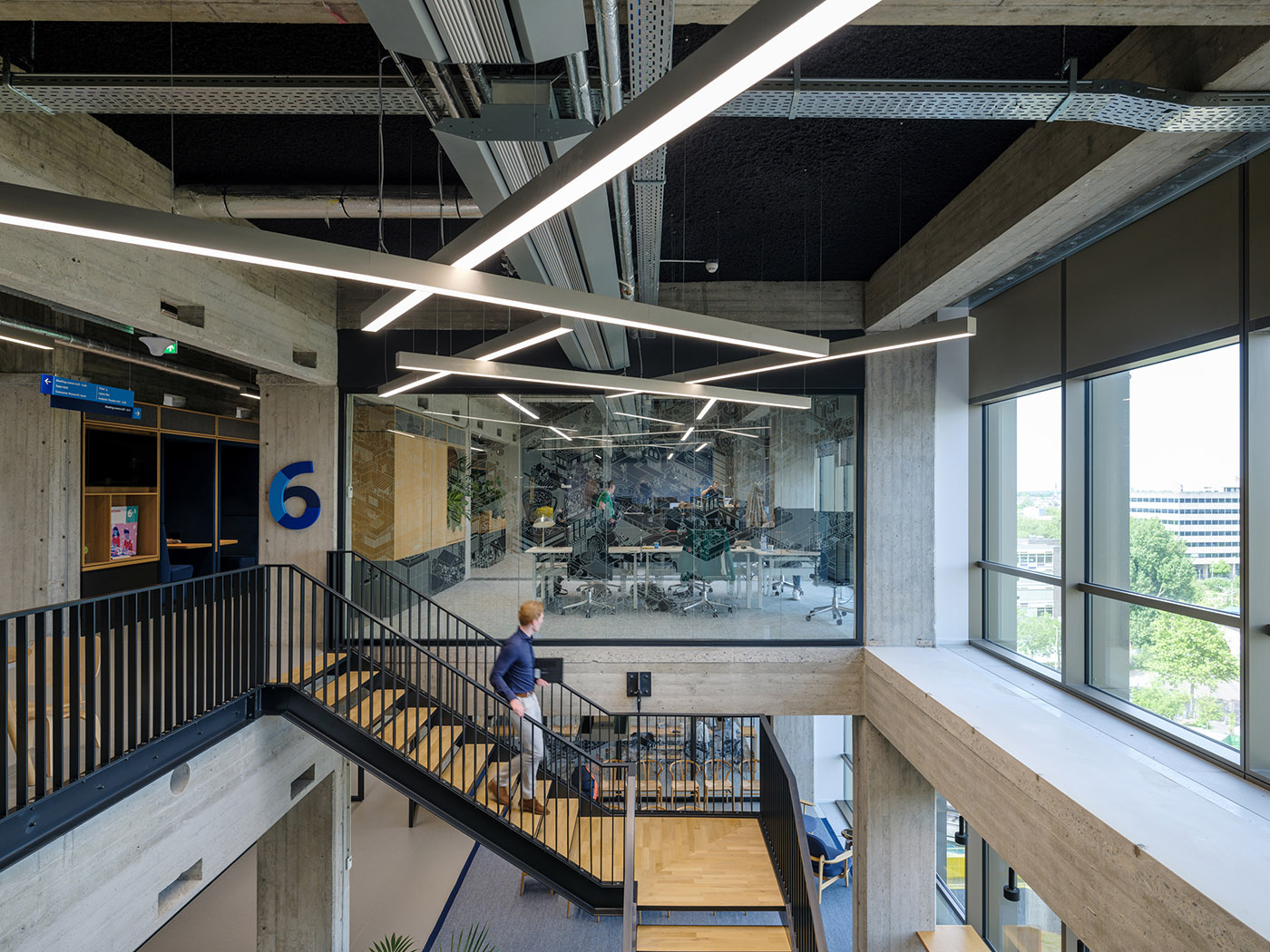 Upon entering the sixth floor of the new Unilever Benelux headquarters, visitors are welcomed into the Lipton Bar, which shows a beautiful view of the city. From here, all floors are accessible by internal stairs. The interior changes envisioned in the design by Mecanoo architecten, who were commissioned for the redevelopment, involve the horizons creating gaps that connect the various floors and consequently the company's employees. Upon entering, the auditorium, the so-called "Town Hall," immediately stands out. This, as well as the event space and restaurant are multifunctional and can be used for events, conferences, and catering