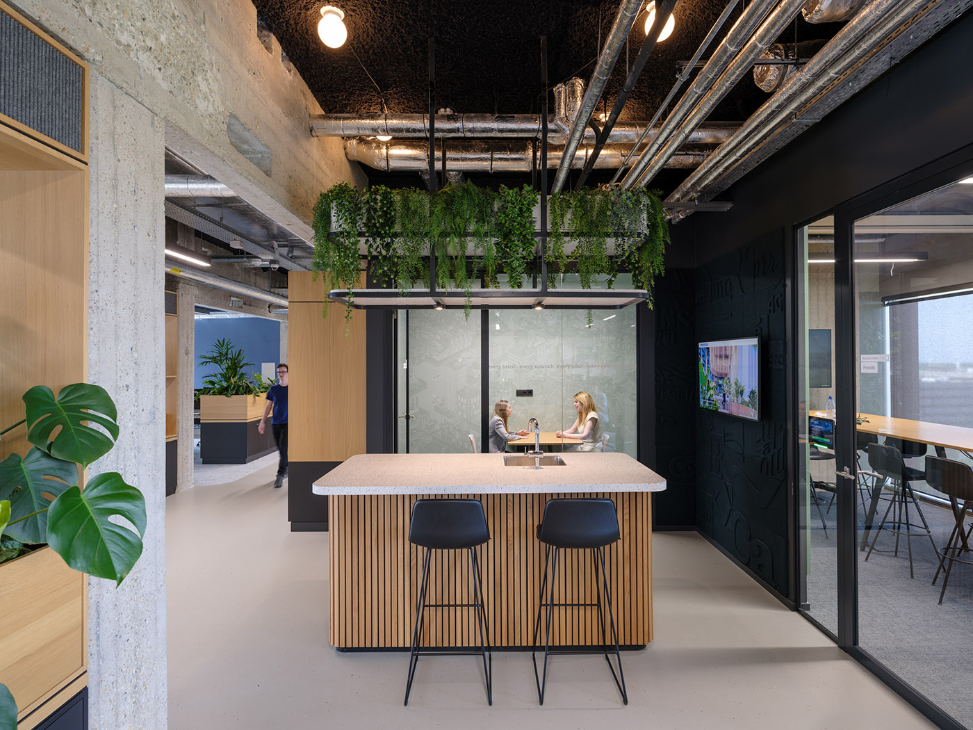 The materials used reinforce the industrial character of the building. Black steel, oak, floor and tiles form a neutral base, giving space to showcase Unilever's products and marketing