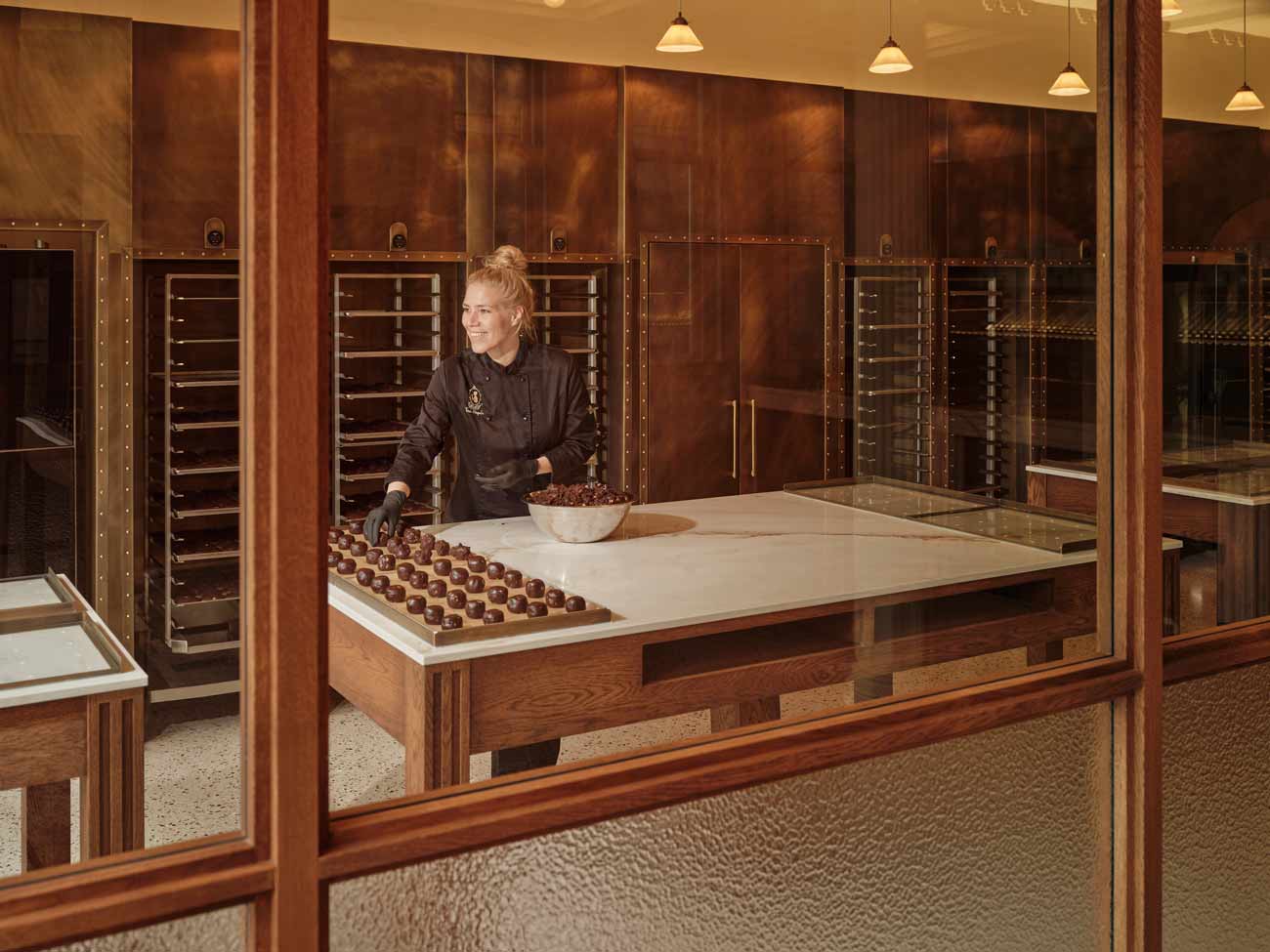 Since 2013, Van Stapele has been baking the best cookies in Amsterdam: a single dark chocolate cookie with a white chocolate center. Its secret? An exclusive recipe that has made this sweet treat an icon of the city, leading to long lines in front of the store every day. Initially located in a small alley in the center, the bakery's popularity necessitated a move to a larger space. Studio Modijefsky was tasked with preserving the magic of the original location, recreating its atmosphere in a larger setting.
