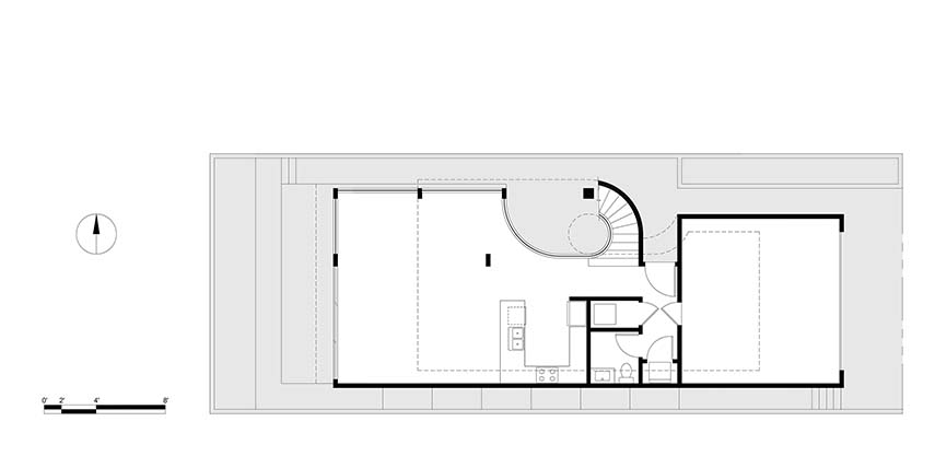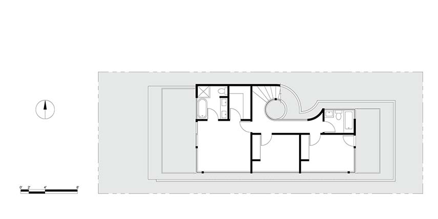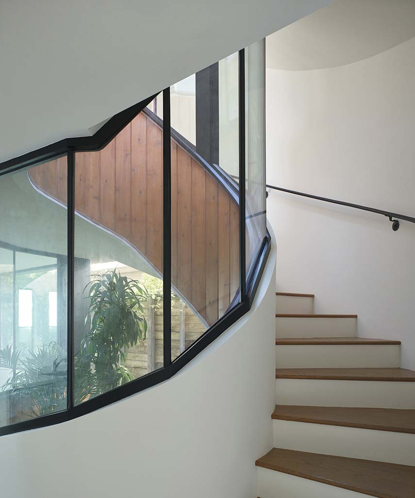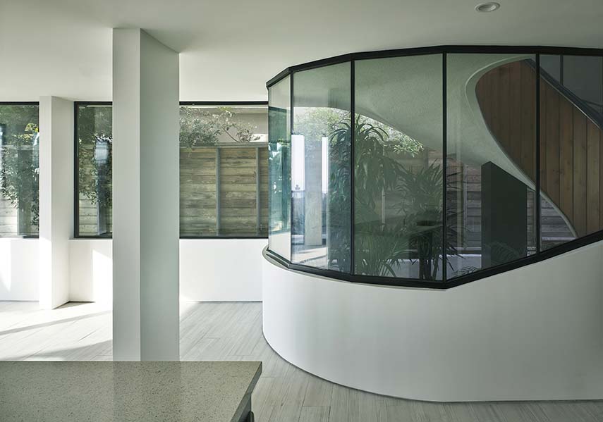 Martin Fenlon Architecture studio designs the villa at Sunset Terrace as an architectural organism where the outdoor space enters and exits the house through an oculus open towards the sky. This curvilinear void characterizes and distributes the entire living space