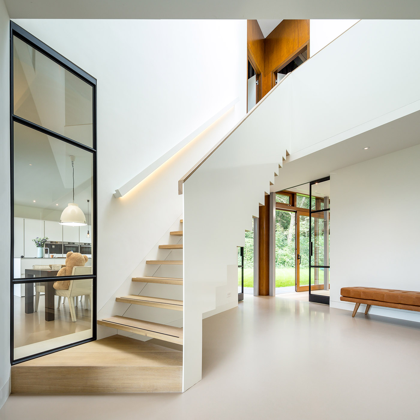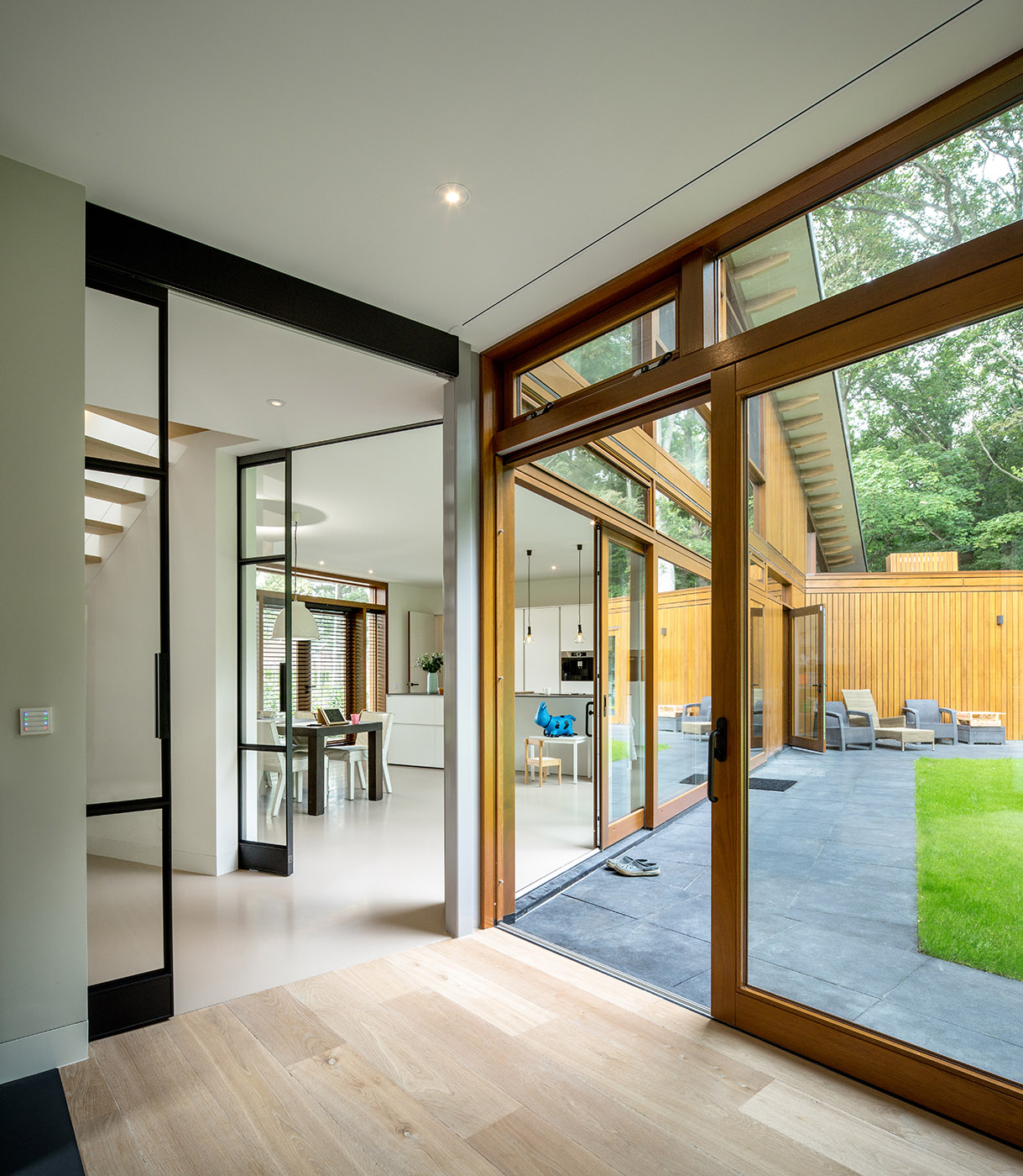 Villa and landscape intertwine in a perfect balance between form and function. Moke Architecten has created one of its most fascinating architectural projects, designing a building where a central triangular room acts as the focal point, projecting three wings into the landscape that harmoniously blend with the surrounding nature. This design maximizes the connection with the environment, transforming the villa into a natural extension of the landscape. The wings of the building, characterized by relief brick cladding, house different functions, ensuring optimal spatial distribution and clear separation between different areas of the residence. In every room of the villa, the presence of the wooded landscape is felt, thanks to the large panoramic windows that make the surrounding forest area tangible. By opening the large sliding doors at the back, the wooded landscape transforms into a landscape room, a dynamic element that becomes an integral part of the house.