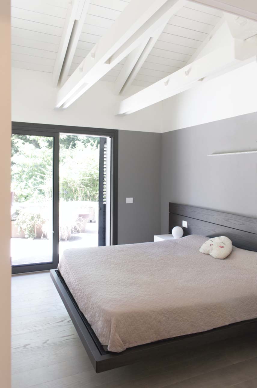 The bedroom is also defined by the structure of the pitched roof with exposed wooden beams, painted white, and the skylight that ensures abundant natural lighting. An oak wardrobe, in line with the kitchen and bathroom furnishings, stands out against the background, balancing the brightness of the ceiling and walls. In this contemporary-style environment, an antique family dressing table fits perfectly, serving as a link between the past and this new interpretation with a slightly rustic and welcoming flavor.