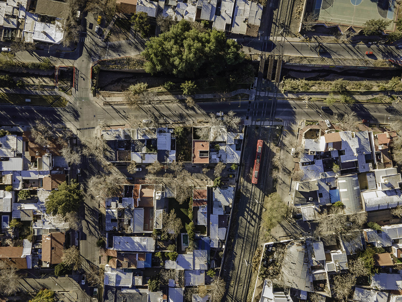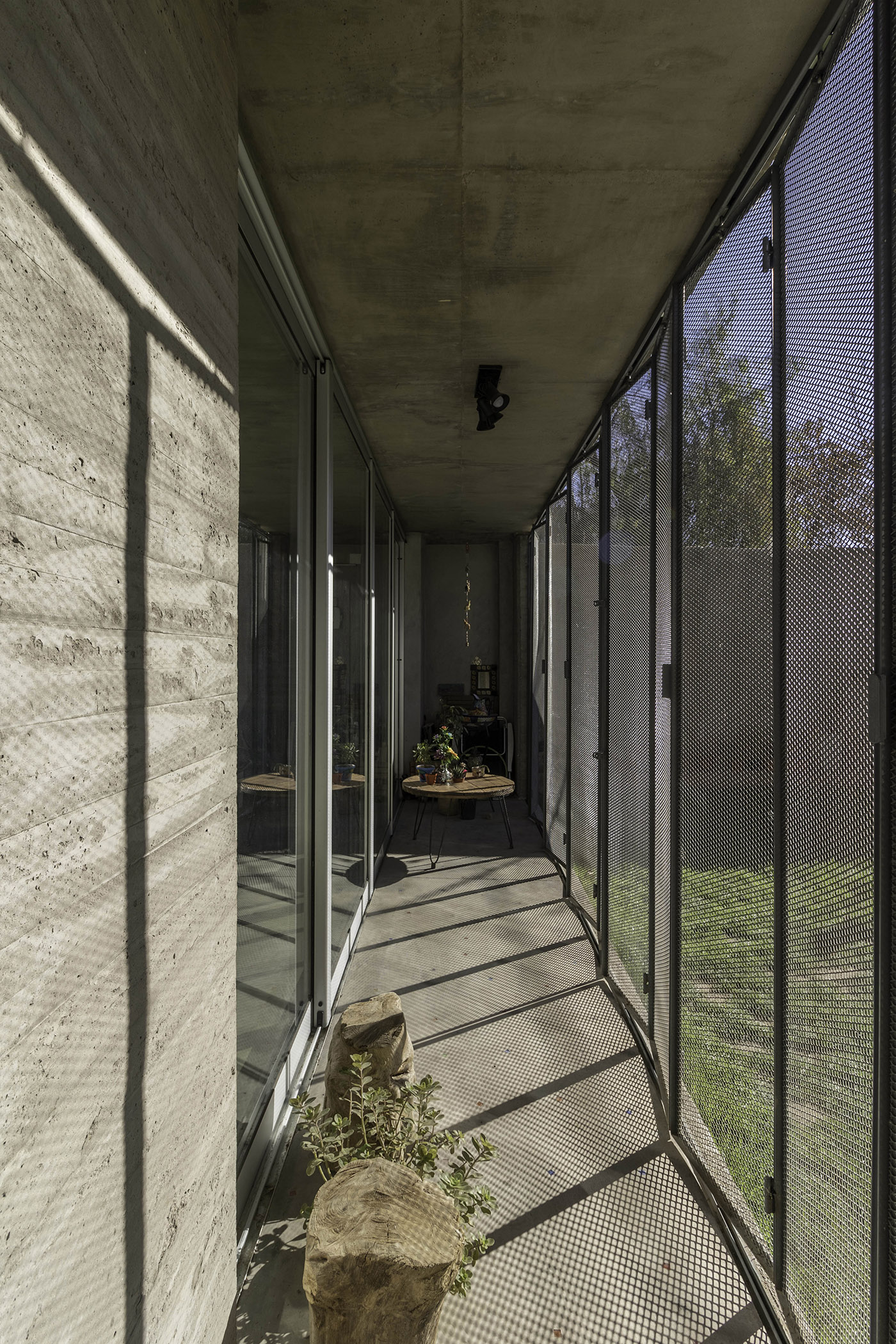 Casa CAS, designed by ONA - Oficina Nómada de Arquitectura, is located on a small plot of 170 square meters in the Sexta Sección neighborhood, Capital department, in the province of Mendoza, Argentina. The context is characterized by a low-rise urban area, with a large channel for protection from summer floods along with a linear park with lush vegetation and the presence of the tracks for the new electric metrotram that connects the city in a north-south direction