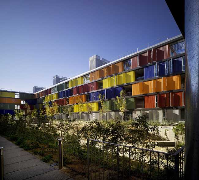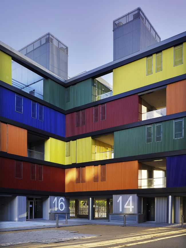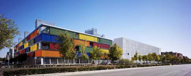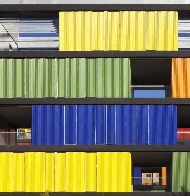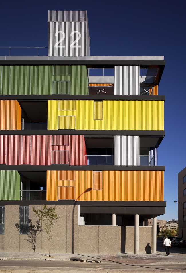 "Memoria Bloque" perforated in Madrid. A permeable building ribbon with intense colors