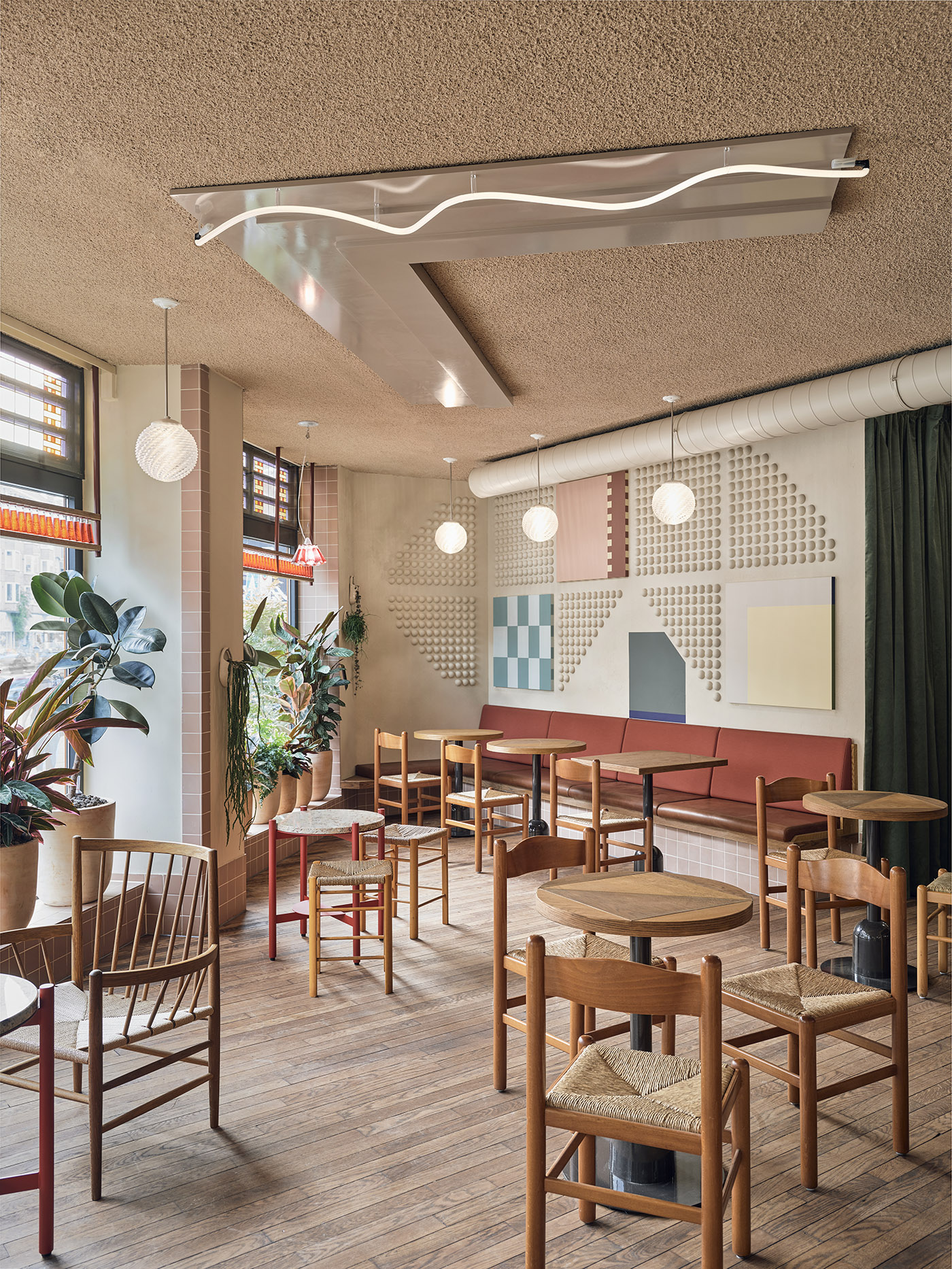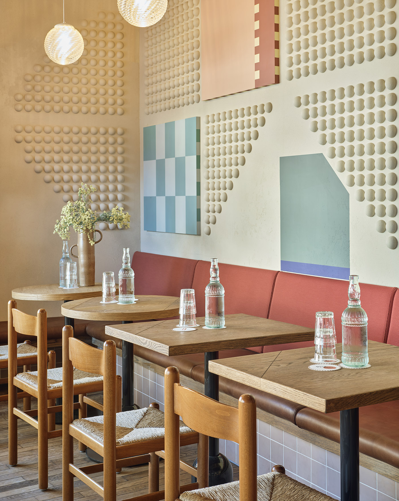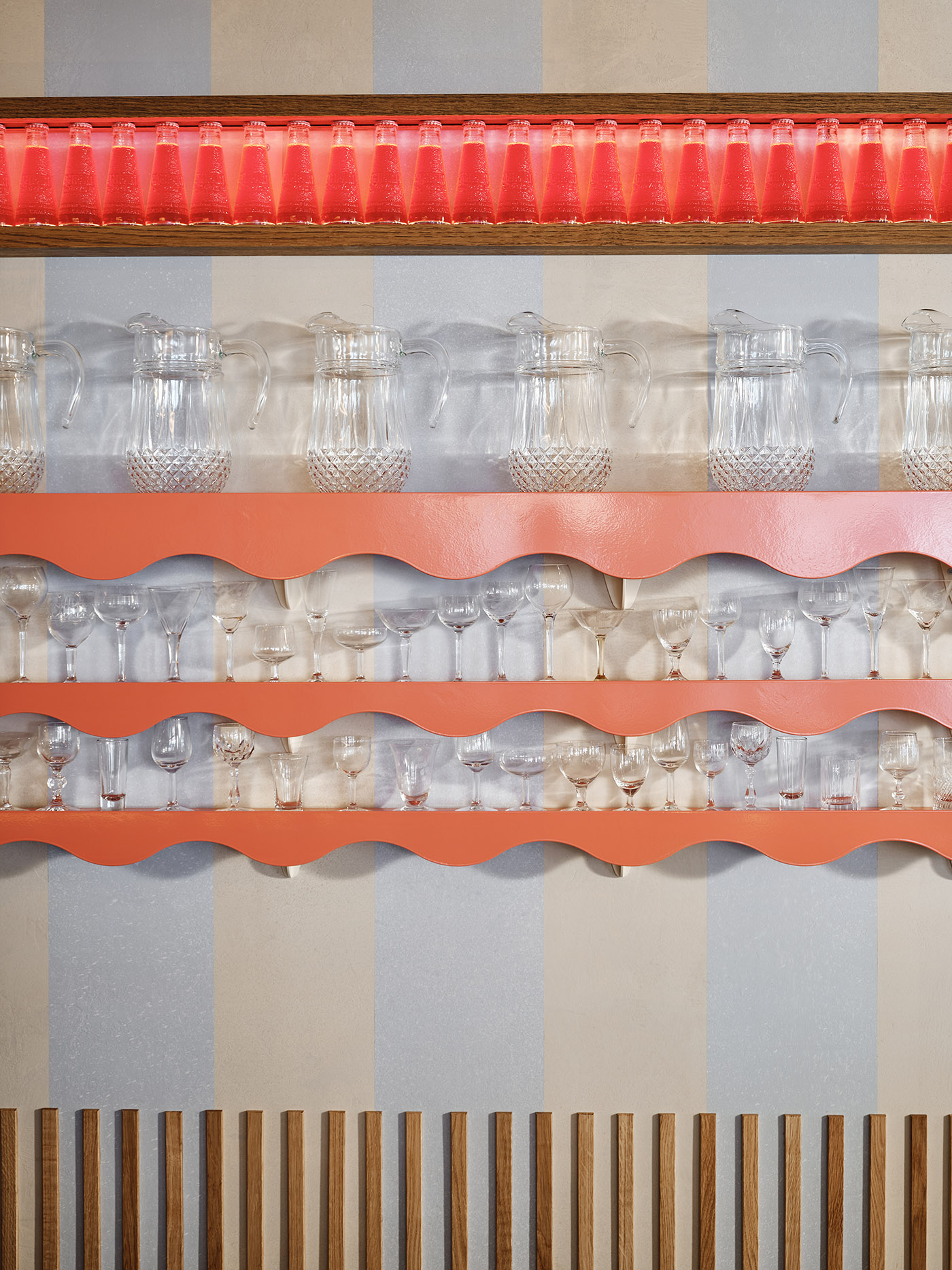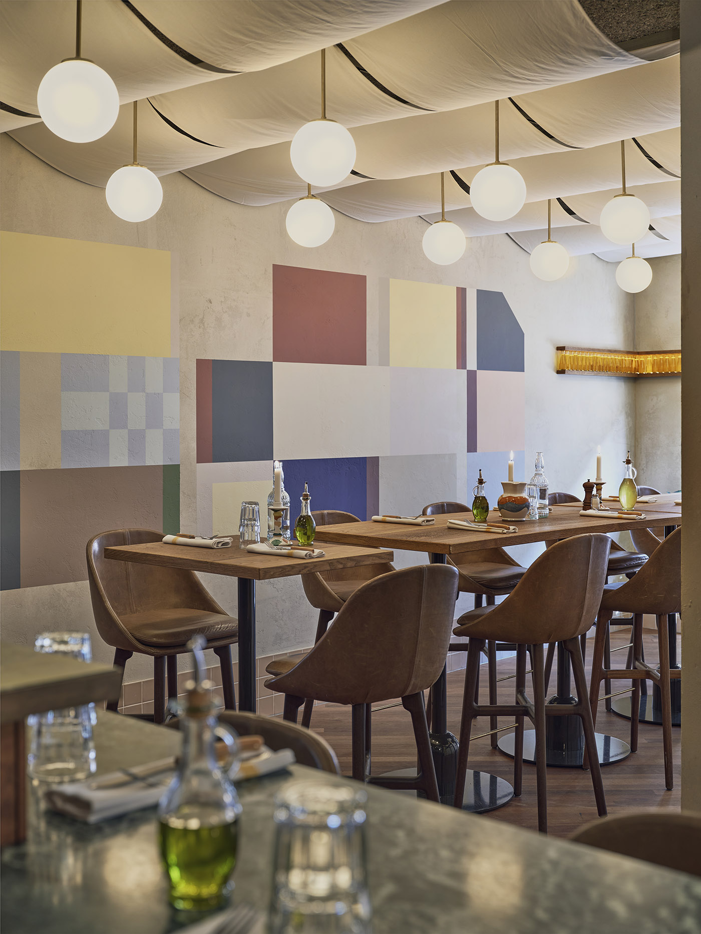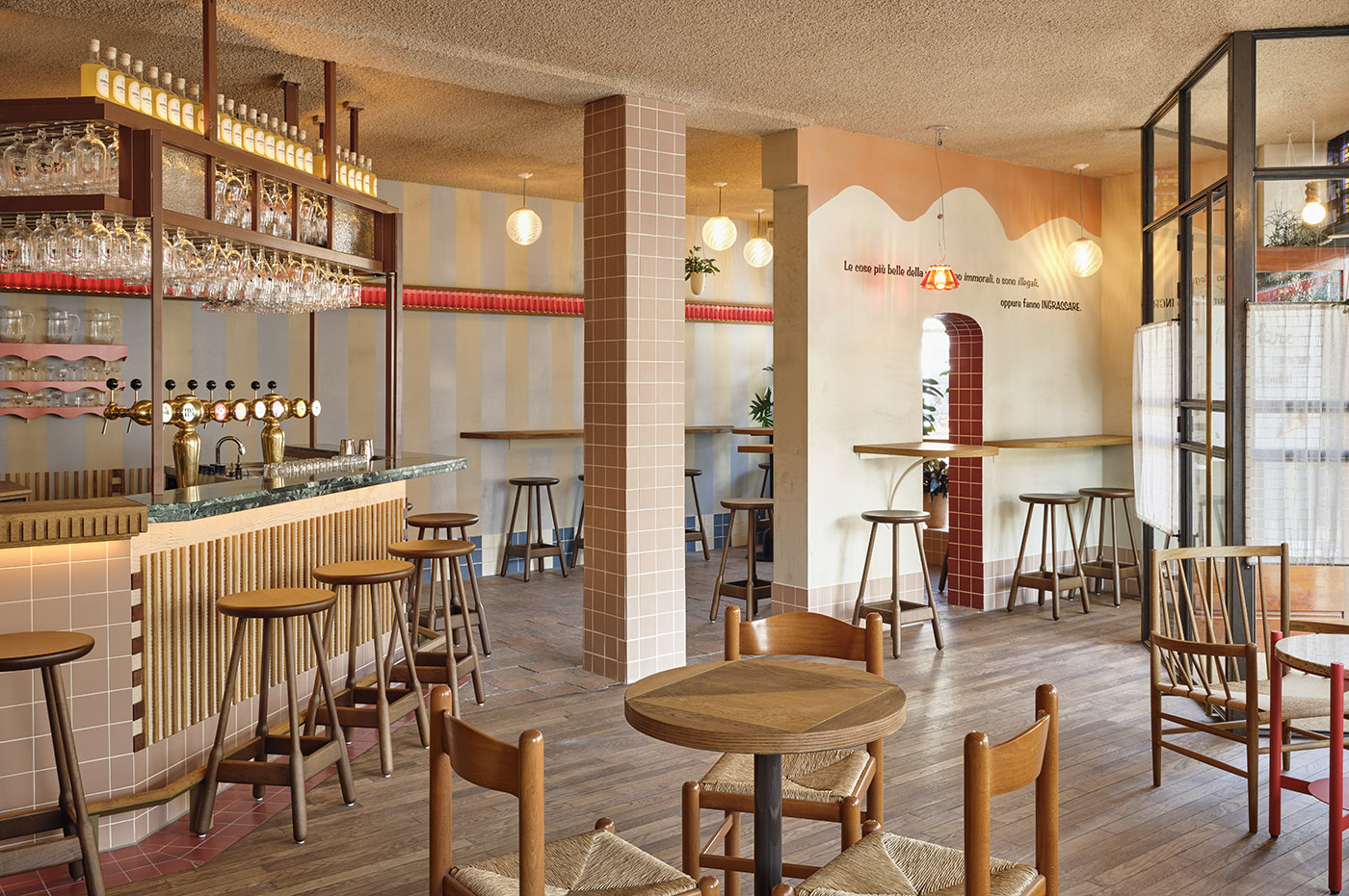 Entering Volare is like traveling to Italy. The playfully traditional graphic interior by Studio Modijefsky combines with a palette of muted reds, oranges, whites and blues that take visitors back to Amalfi Costa in the 1960s. The timeless elements, such as ceramic tiles, plaster, rough textures, striped patterns, and cotton fabrics, evoke a relaxed and entertaining atmosphere that is purely Italian