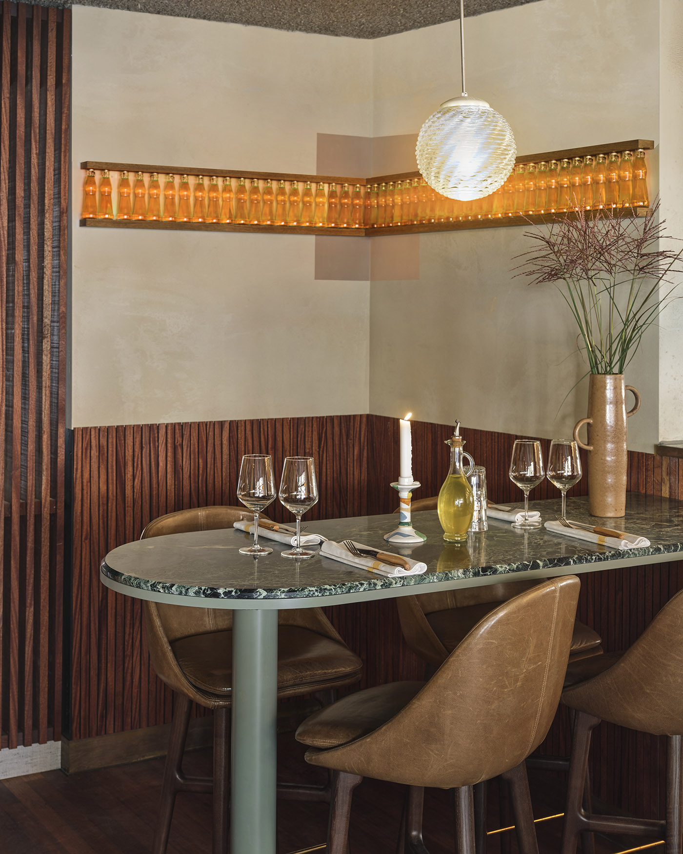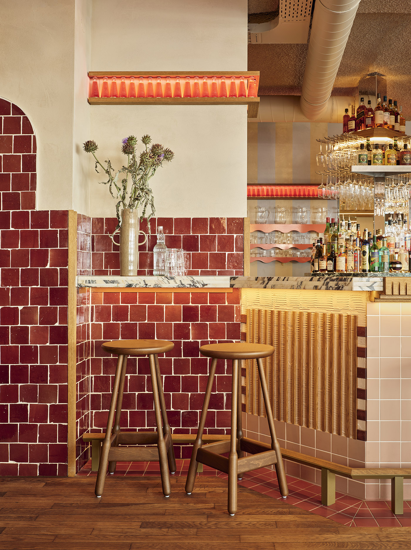 Legendary Italian architects seem to be the hidden directors of this project. The harmonious balance of simple background and cheeky elements lends a fresh and unique touch to a predominantly traditional setting. Soft, delicate hues open the doors to a casual yet refined cocktail bar where you can enjoy an aperitif from the refined selection of appetizers