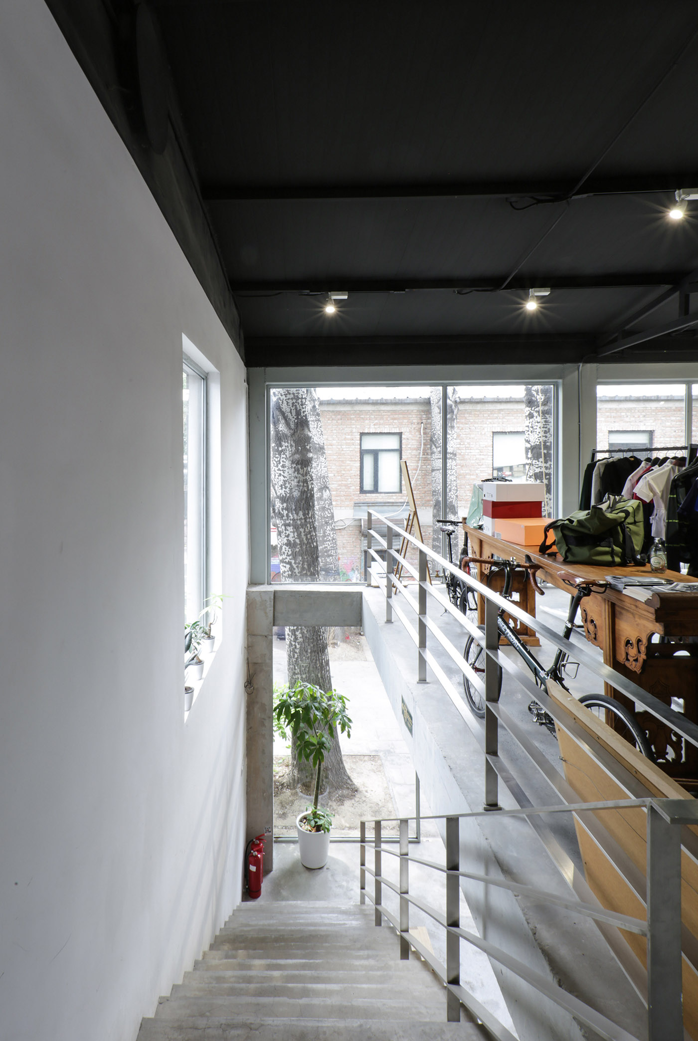 This way, customers can enter from the entrance of the café or the bike store, and they can have the interesting experience of drinking a coffee while watching the bike repairs. The upper floor, on the other hand, is left as open space. The ground outside of the courtyard has been entirely poured with concrete, to make sure there are no passages between the inside and outside