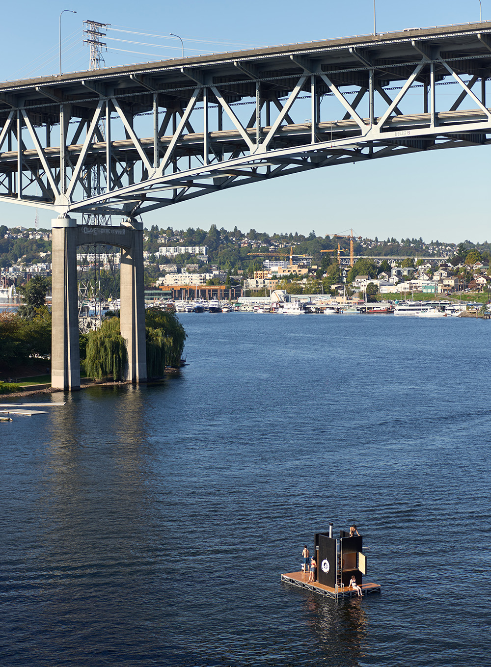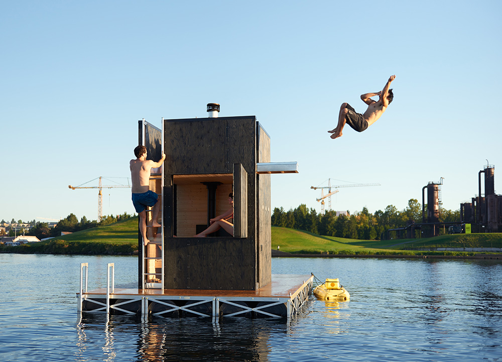 The floating sauna was built according to the design by goCstudio, an architectural firm based in Seattle specializing in commercial and experiential architecture projects, on a privately owned ship. The vessel can accommodate up to six people, is powered by an electric motor, and heated by a wood stove.