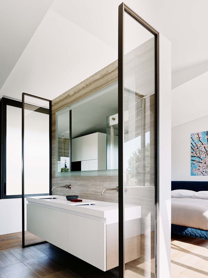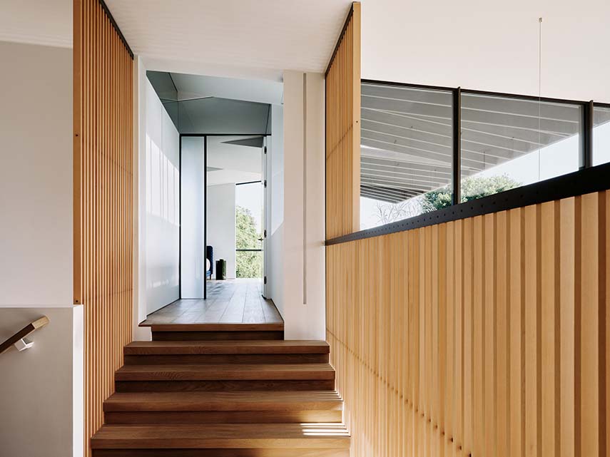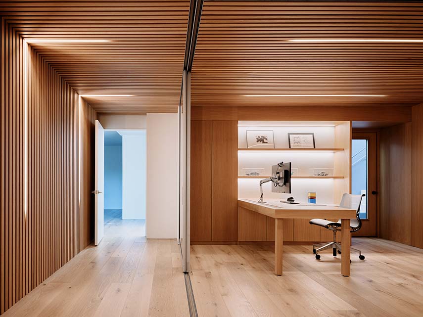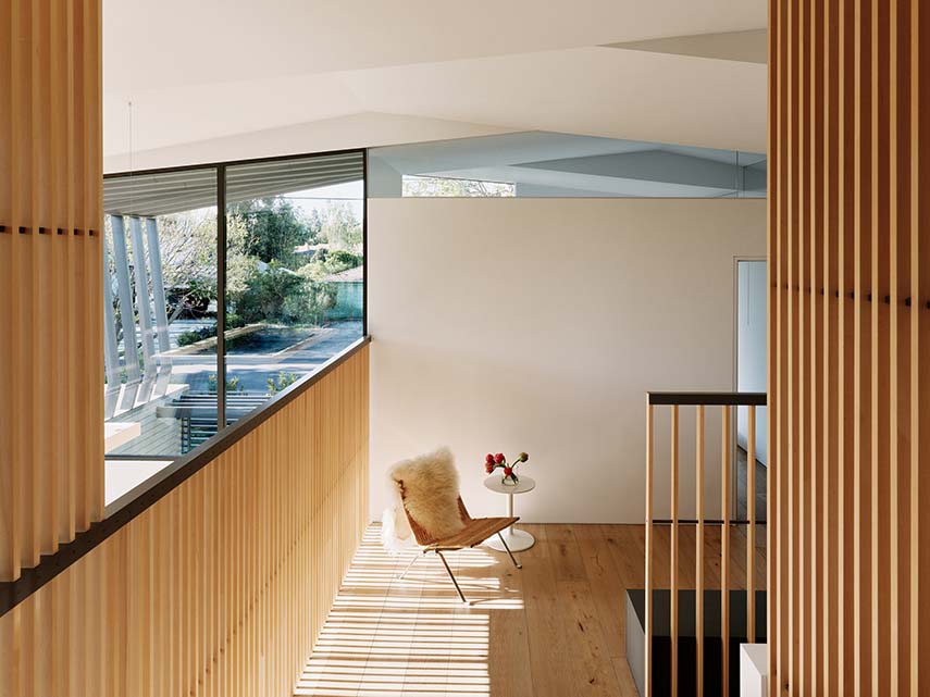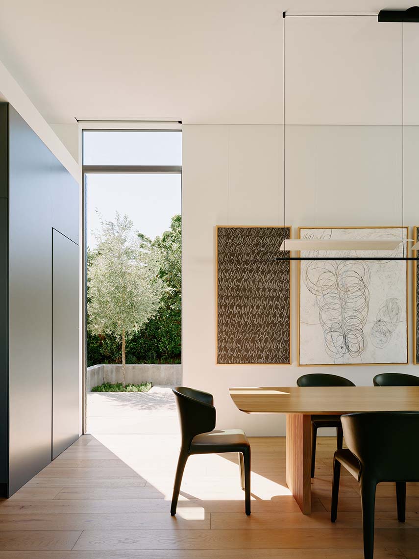 Built on a narrow lot with setbacks on the sides and designed by Fougeron Architecture, the evocative facade inspired by mid-century hides a surprisingly modern back. The metal and wood slats at the entrance provide a sober aesthetic while ensuring greater privacy for the residents. The asymmetry of materials in the front courtyard evokes the playful and dynamic spirit found at the back of the house.