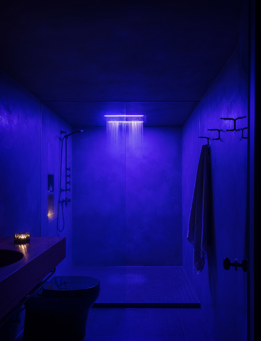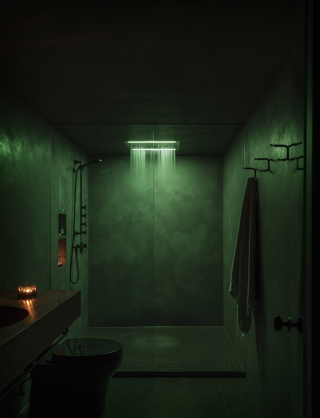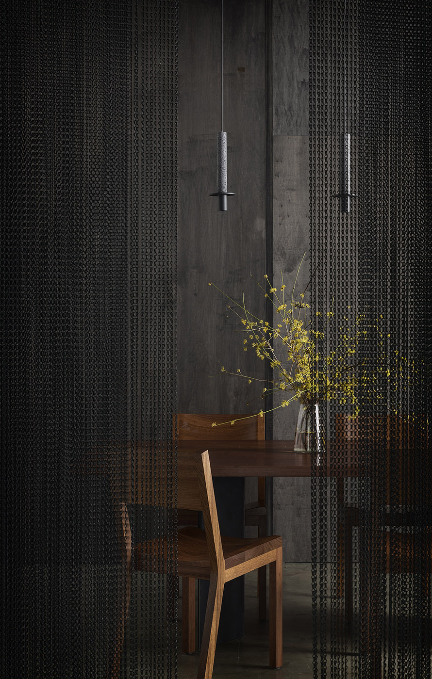 This box is made of stained plywood on the outside, the bedroom is lined with felt and the bathroom has a Venetian stucco finish. A dark palette forms the backdrop to the open-plan space