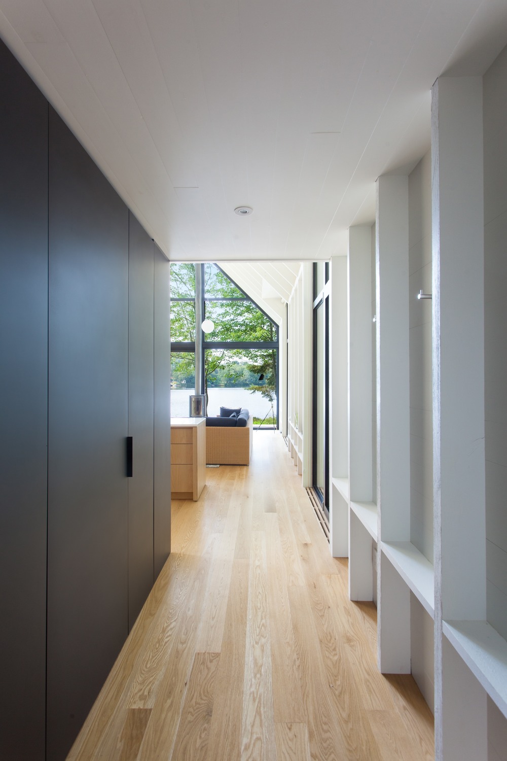 The complete transparency of the southern facade leaves ample sunlight in autumn and winter, while the mature trees between the house and the lake moderate the summer sun and offer a high degree of privacy in the sailing season. The balloon structure, with its exposed wooden bosses and white painted beams, giving the building a unique rhythm of light and shade