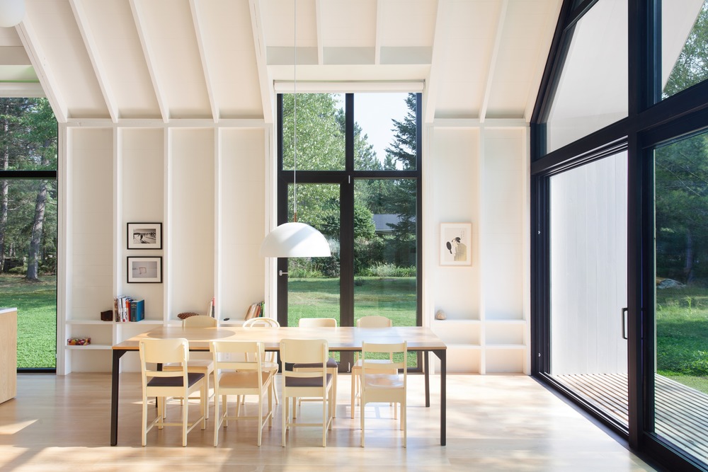 The exterior of both the roof and the walls is entirely covered with white cedar boards. On both long sides of the building there are three large high glass panels that create a continuous link between the interior and exterior spaces. The south side is entirely made of glass, creating a direct link between the lake and the living spaces, arranged under a large double-height pediment that extends outwards to cover a small porch