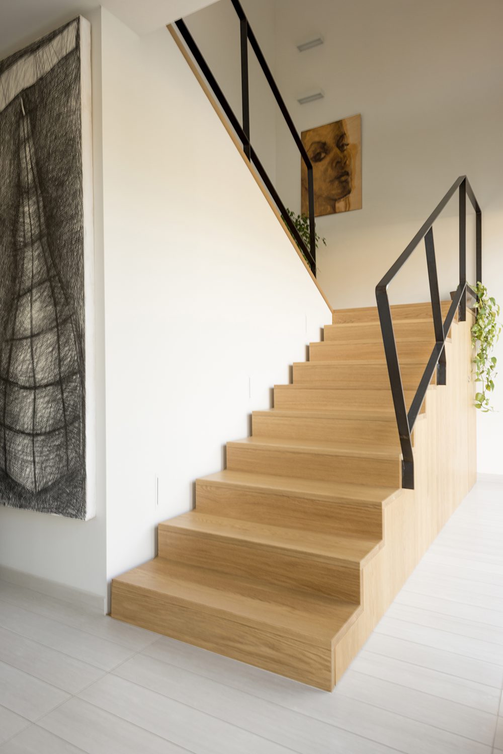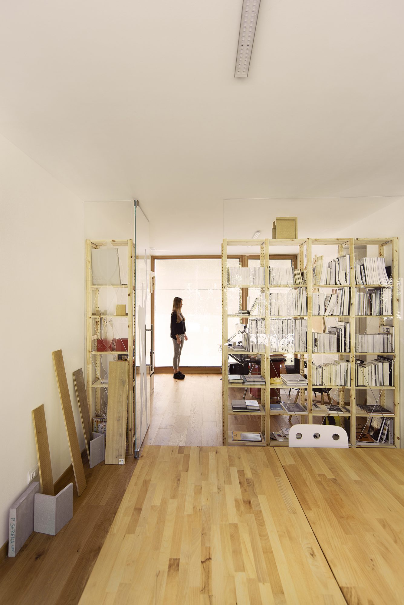 On the first floor, the directionality of the building is opposite, no longer transverse but longitudinal; the building opens on the short sides and hosts a large projecting meeting room to the east and a loggia to the west that overlooks a small park