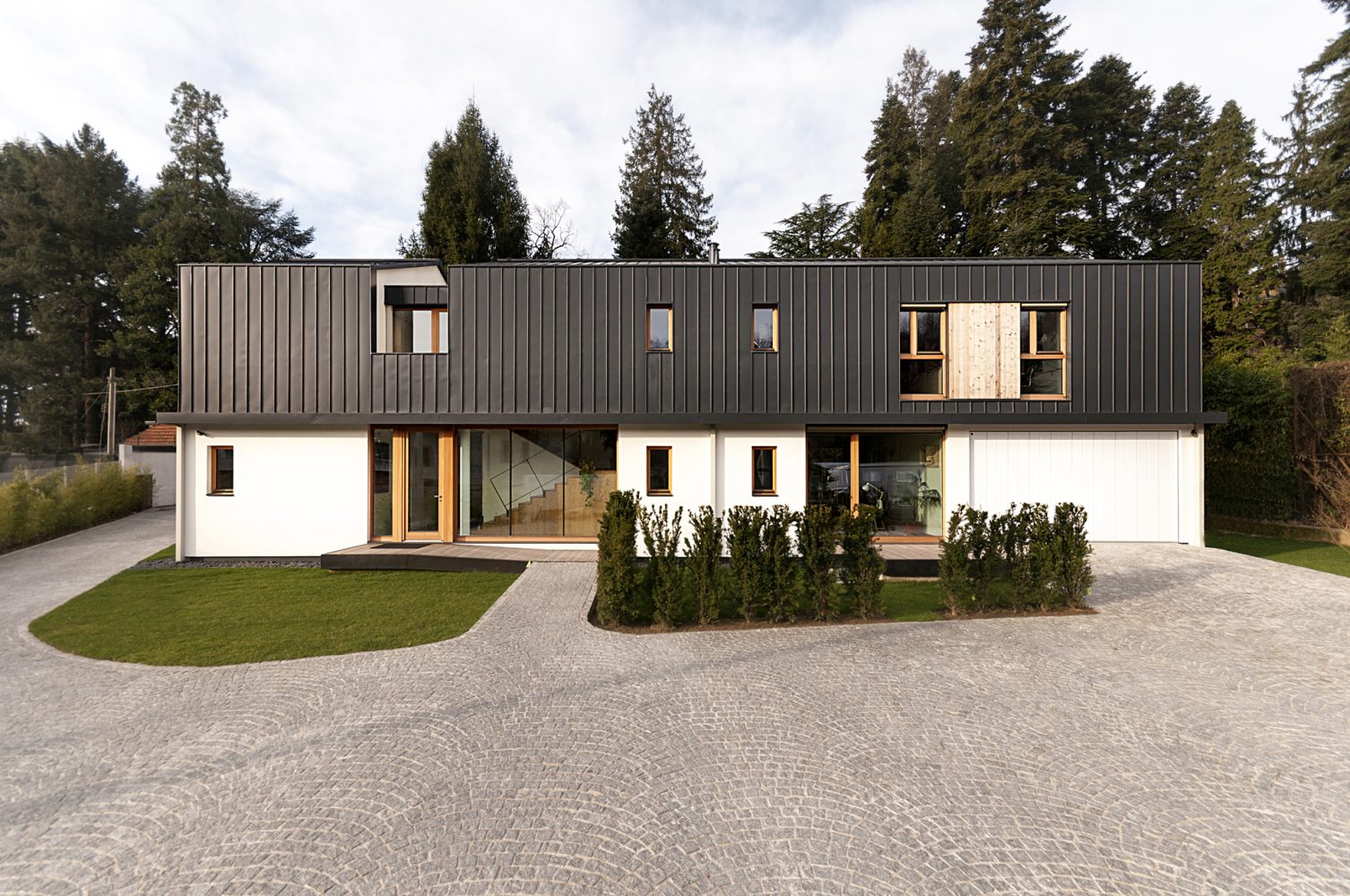 The roof, partly integrated with photovoltaic panels has two pitches and is reminiscent of the houses without eaves designed by the children; the cladding of the roof is the same as the vertical walls on the first floor: it is a sheet of graphite-coloured metal; in this way, the building has an extremely contemporary look while maintaining its status as a homestudio