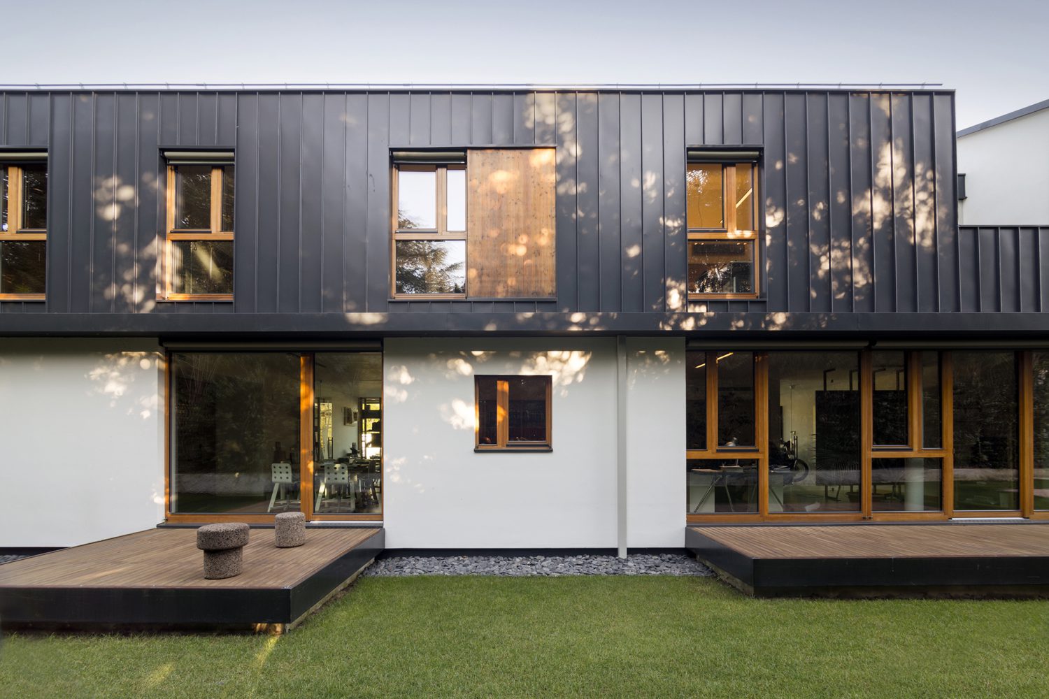 The project idea is very simple: it is a prefabricated wooden building with a rectangular plan, 8 meters high. The ground floor is made up of three plastered and therefore opaque "boxes" alternating with two transparent "boxes"; the large windowed surfaces put the interior spaces in close transversal relation with the garden. In this way, the relevant greenery becomes the protagonist of the work space: work in the nature