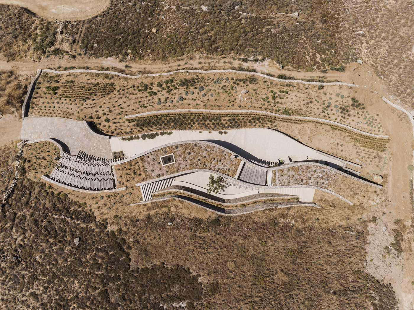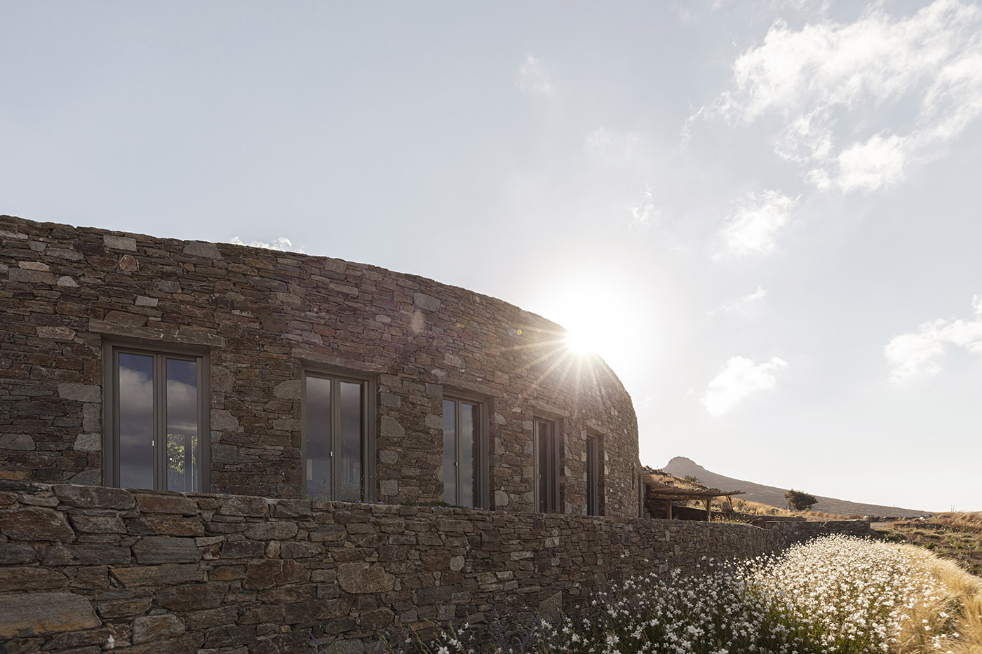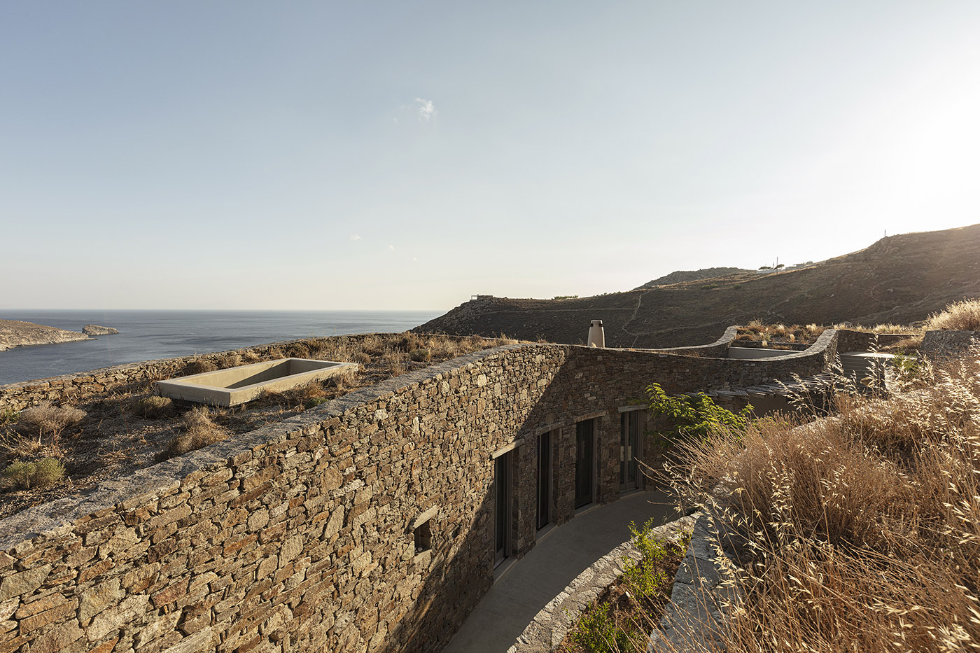 Sinas architects' main goal is to integrate the house as much as possible with its natural environment, characterized by large and beautiful rock formations. Xerolhites are the most important existing element, small stone retaining walls created for the purpose of landscaping the land