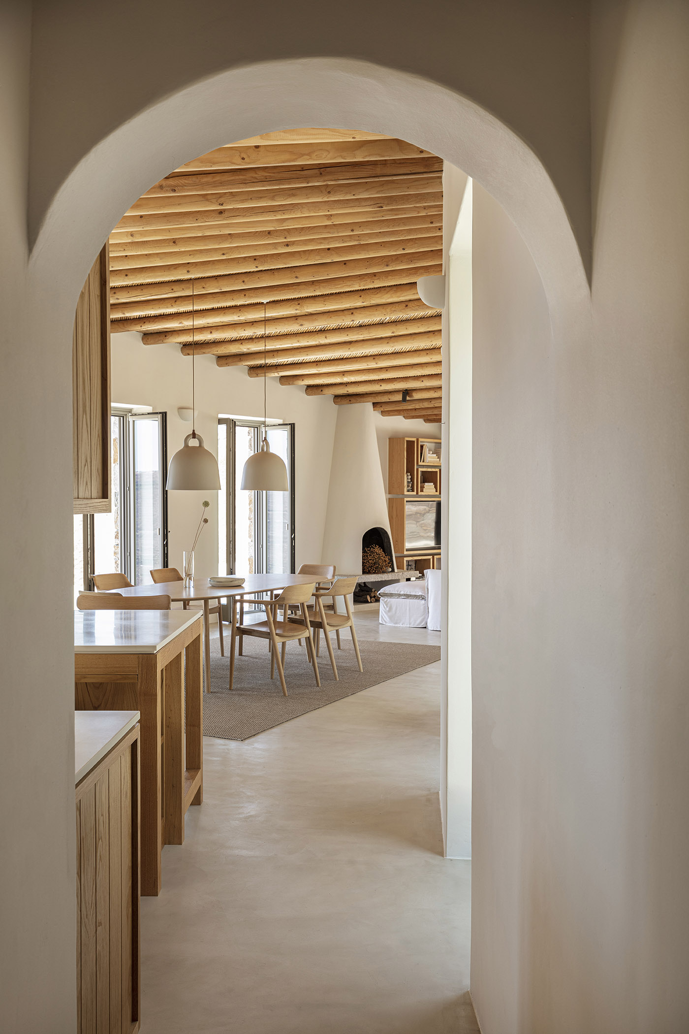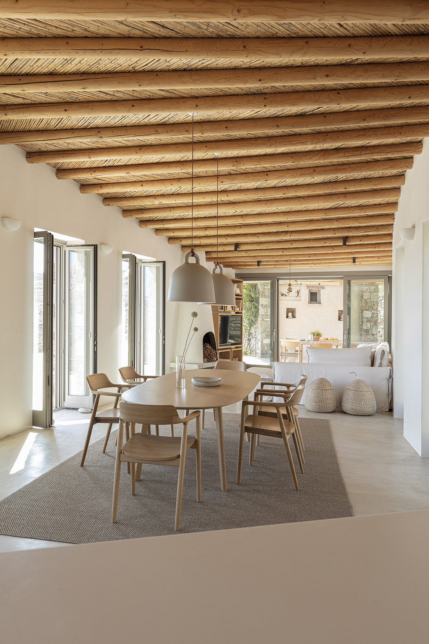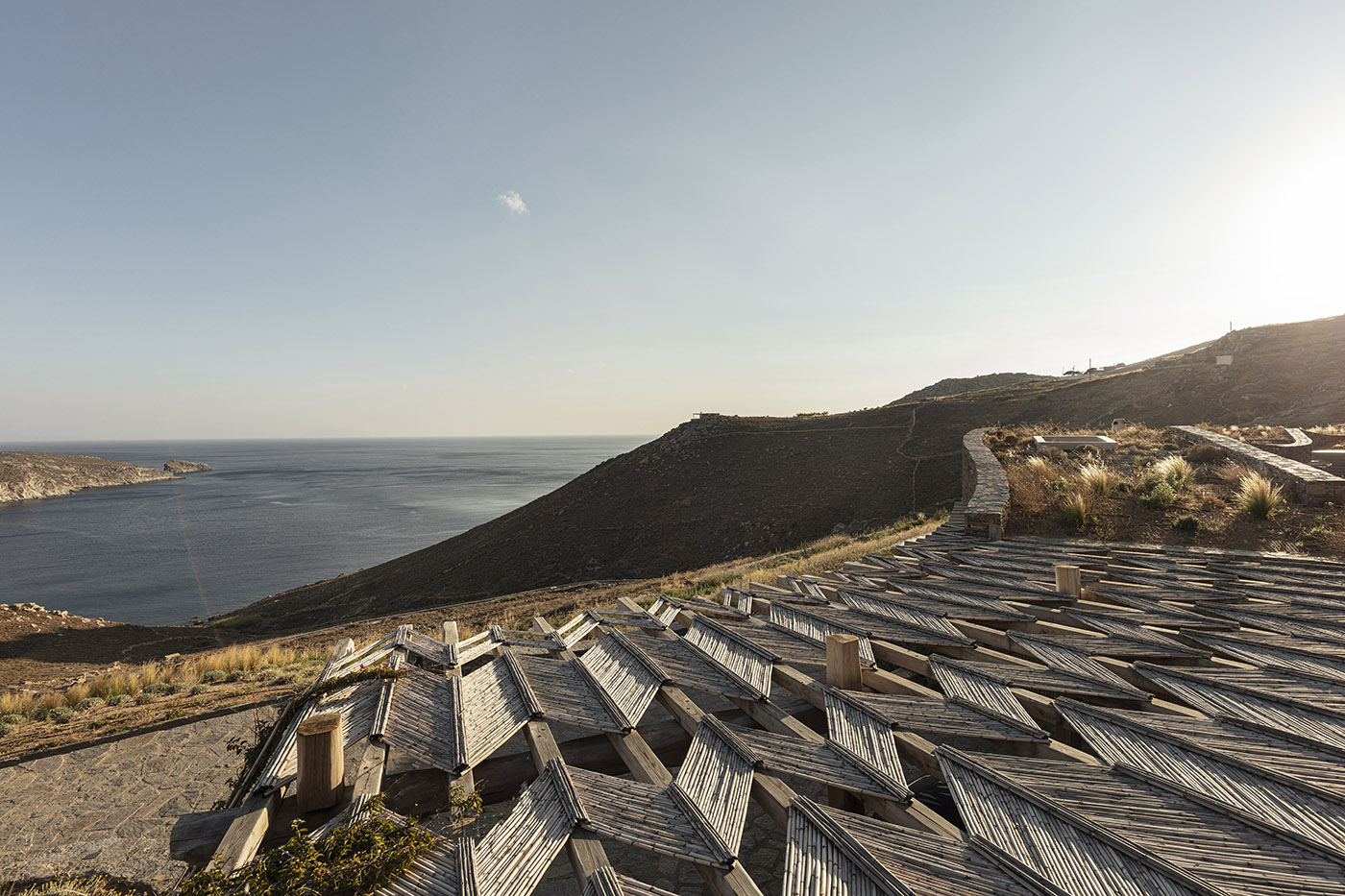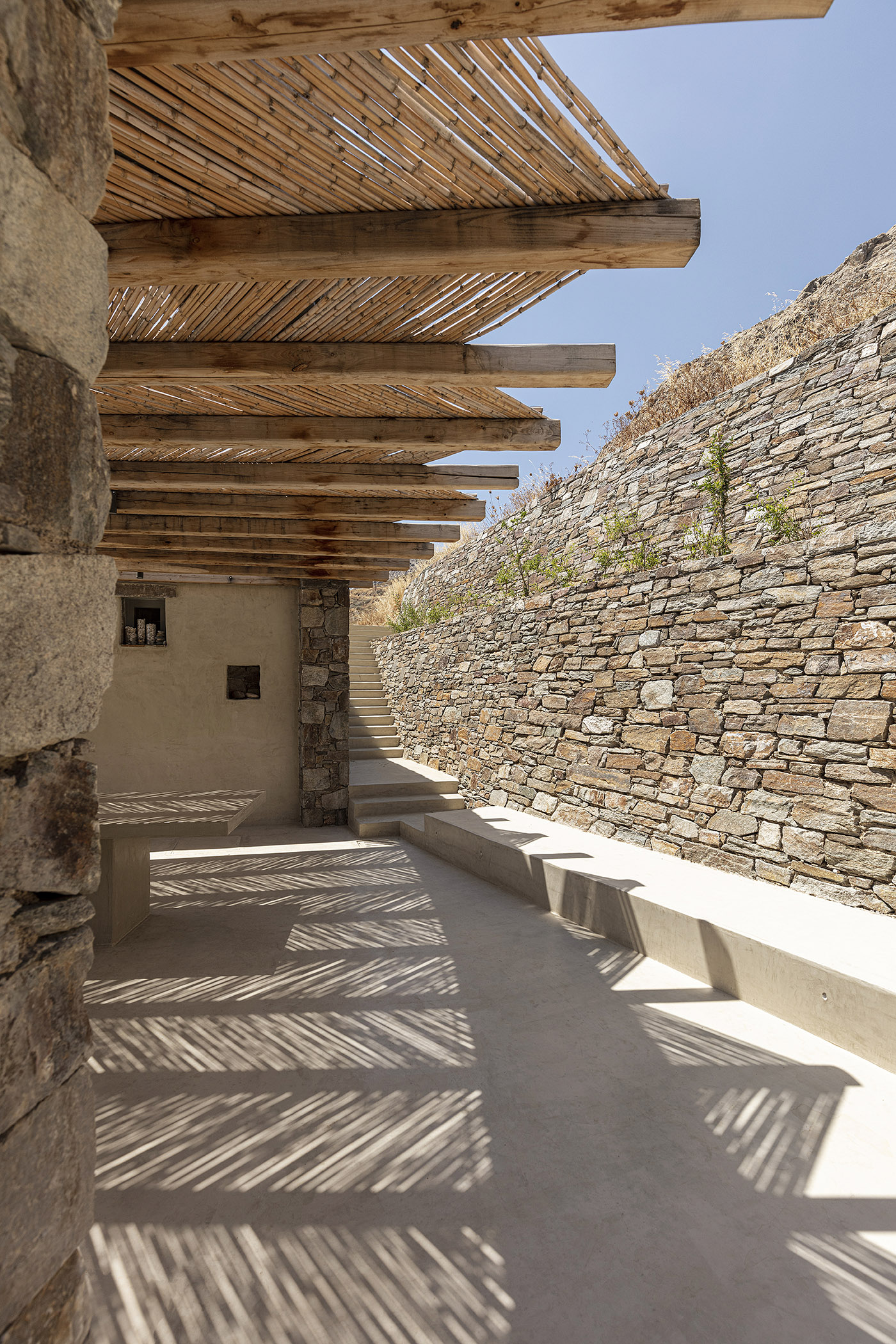 The traditional bamboo pergola with its rough wooden beams is visible along the entire length of the house, inside and outside. The beams follow the sinuous morphology, like the vertebrae of a long spinal cord, and the roof, covered with earth and vegetation, is imitating the natural landscape, while making the house almost invisible. The doors and windows are wooden and plain with a light olive color, and the main exterior walls are stone without mortar for joints