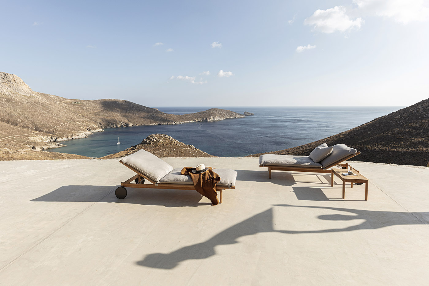 The house, with its sinuous morphology, integrates seamlessly into the natural landscape: steep dirt and gravelly slopes along with beautiful rock formations embrace the Xerolithi project, named after the site's rocky feature