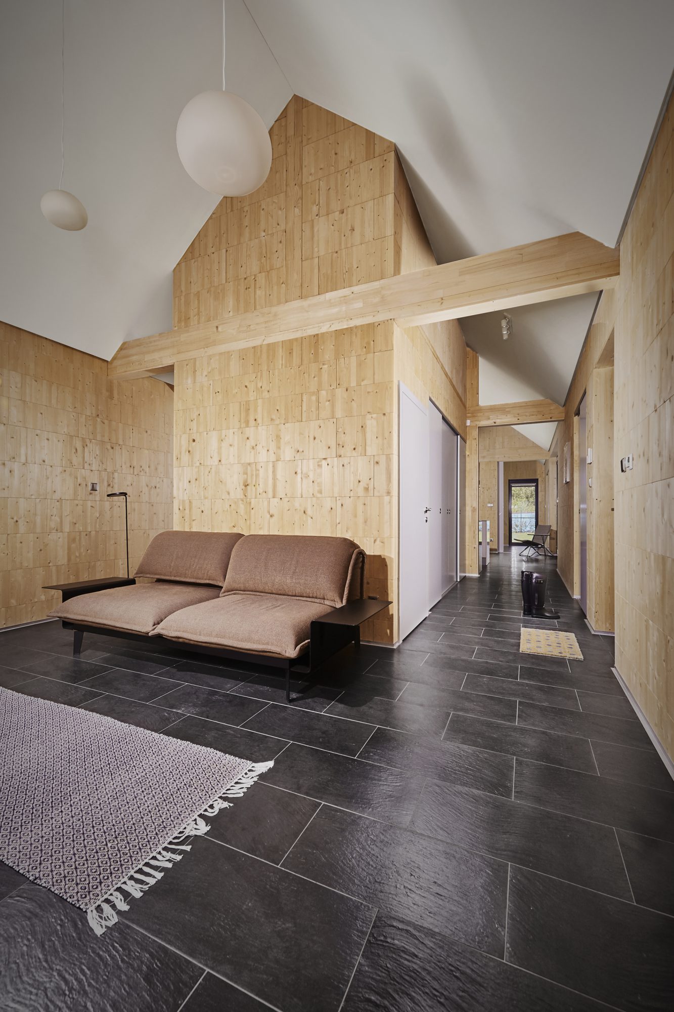 The construction of the house was carried out entirely with wood, in this case, the designer used the Swiss system that was developed in collaboration with the Zurich-based company. The building elements used are bricks made of solid fir wood, which can be filled with different types of insulators