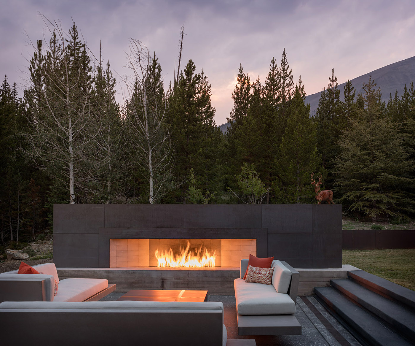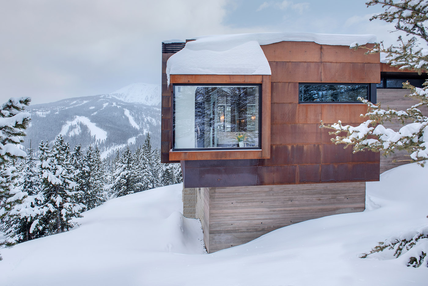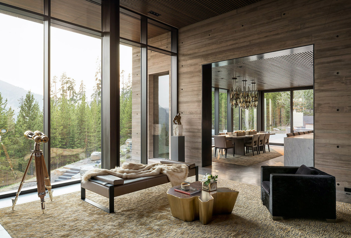 The structure of the house is mainly composed of two thick concrete walls that extend through the landscape from north to south. The first wall runs north/south and guides guests into the house, leading them to views of Pioneer Peak. A second concrete wall runs perpendicular to the first wall and features faceted planes that orient towards a tall, narrow window found in the staircase and living room.