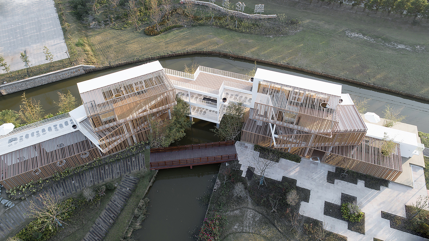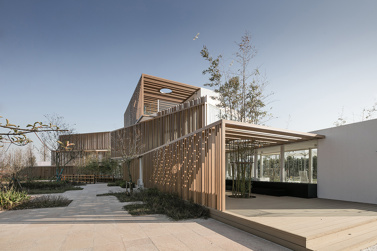 The project, located in Orenda - Chongming Island, near Shanghai, has been constructed with old containers. Their location, isolated on an open pasture, as well as the narrow interior spaces of the containers, made the project challenging. In order to give the ten staggered containers a unique aesthetic, the designers extended the interior space of the containers to the outside, creating an empty box connected to each closed container.