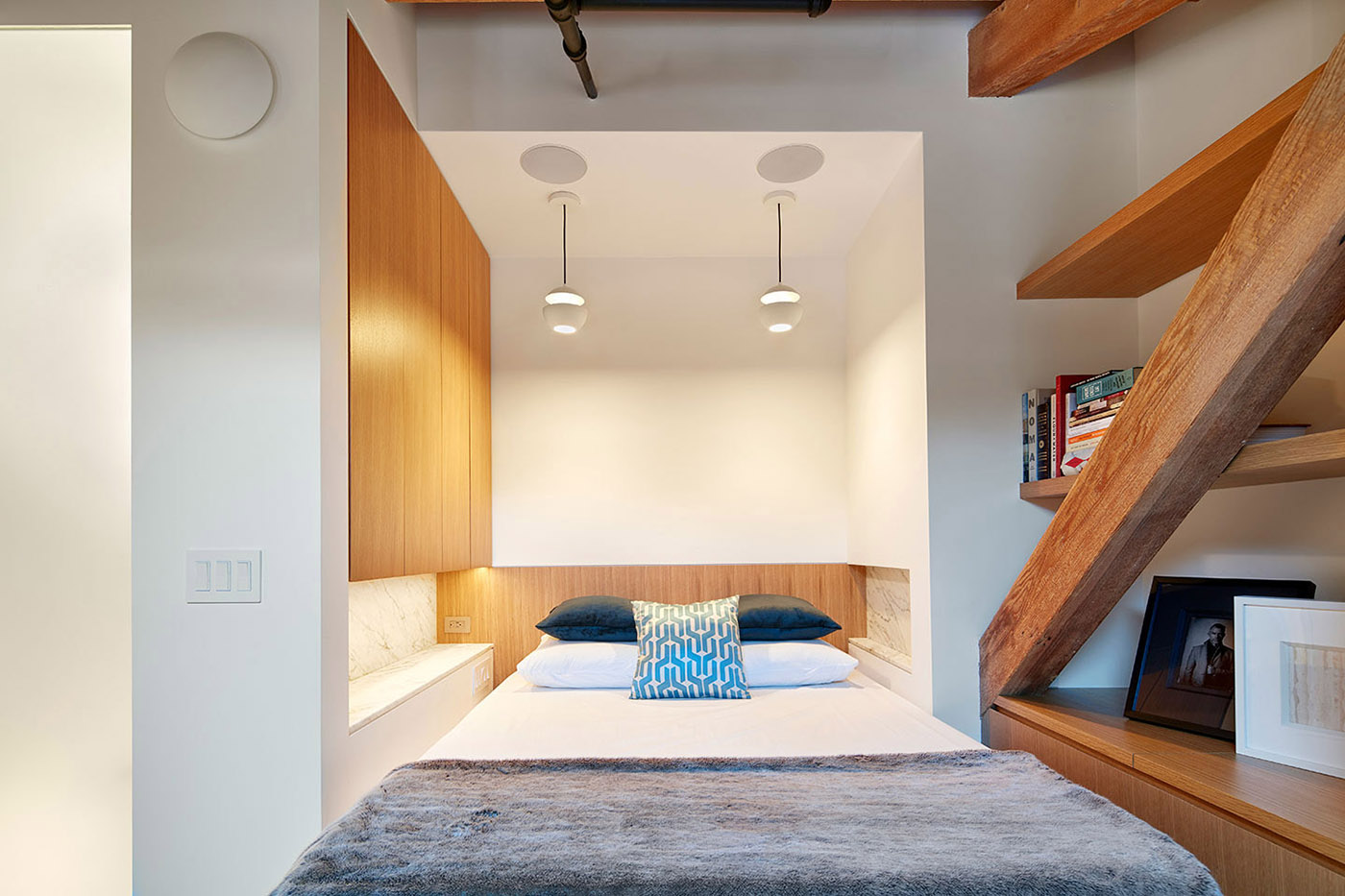 York Loft is a modern loft with one bedroom and a bathroom, located in a renovated brick and wood building. As the client had to rent the space when he was not in town, a bicycle rack with a removable lock and a storage room behind the television were added to the space