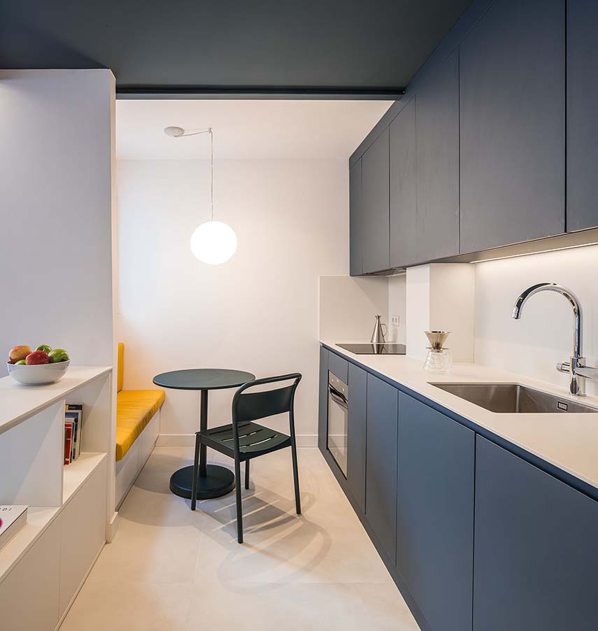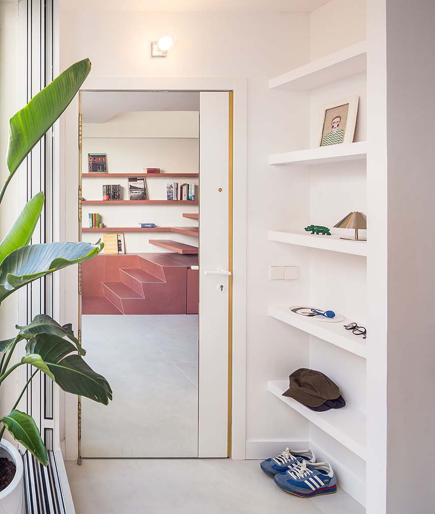 Binôme House, designed by gon architects, was born from Philippe's desire to move without leaving, staying in the Conde Duque neighborhood but radically rethinking the home where he had lived for five years. The penthouse, an internal 80 sqm duplex in a building from 1900 renovated in 2006, had an extremely narrow section - just 3.25 meters - and a distribution that was not consistent with a lifestyle that is both social and introspective. Overly compartmentalized spaces, a terrace disconnected from the interior spaces, and an invasive and poorly positioned staircase compromised the overall quality of the space, despite the privileged view towards the silhouette of the Torre de Madrid.