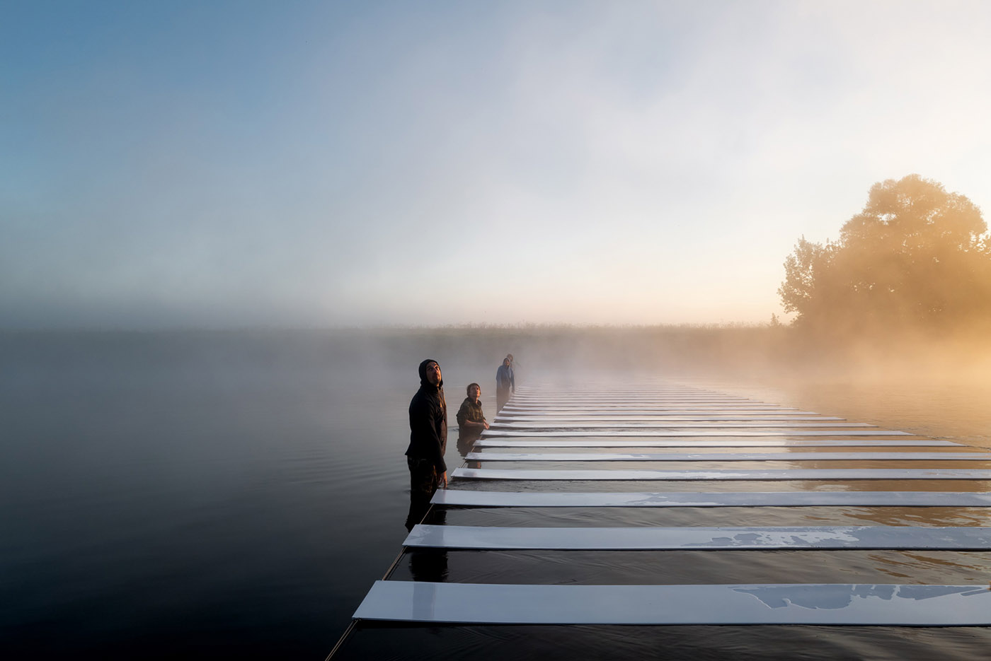 "Crossroads" de Gregory Orekhov, realizado en policarbonato pintado, es un puente, un paso de río peatonal que conecta los campos aparentemente interminables que lo bordean. Este objeto de arte paisajístico se encuentra en la región de Moscú, en la zona de Nikolina Gora. Con esta obra, el artista plantea la cuestión del comportamiento social, ético y medioambiental