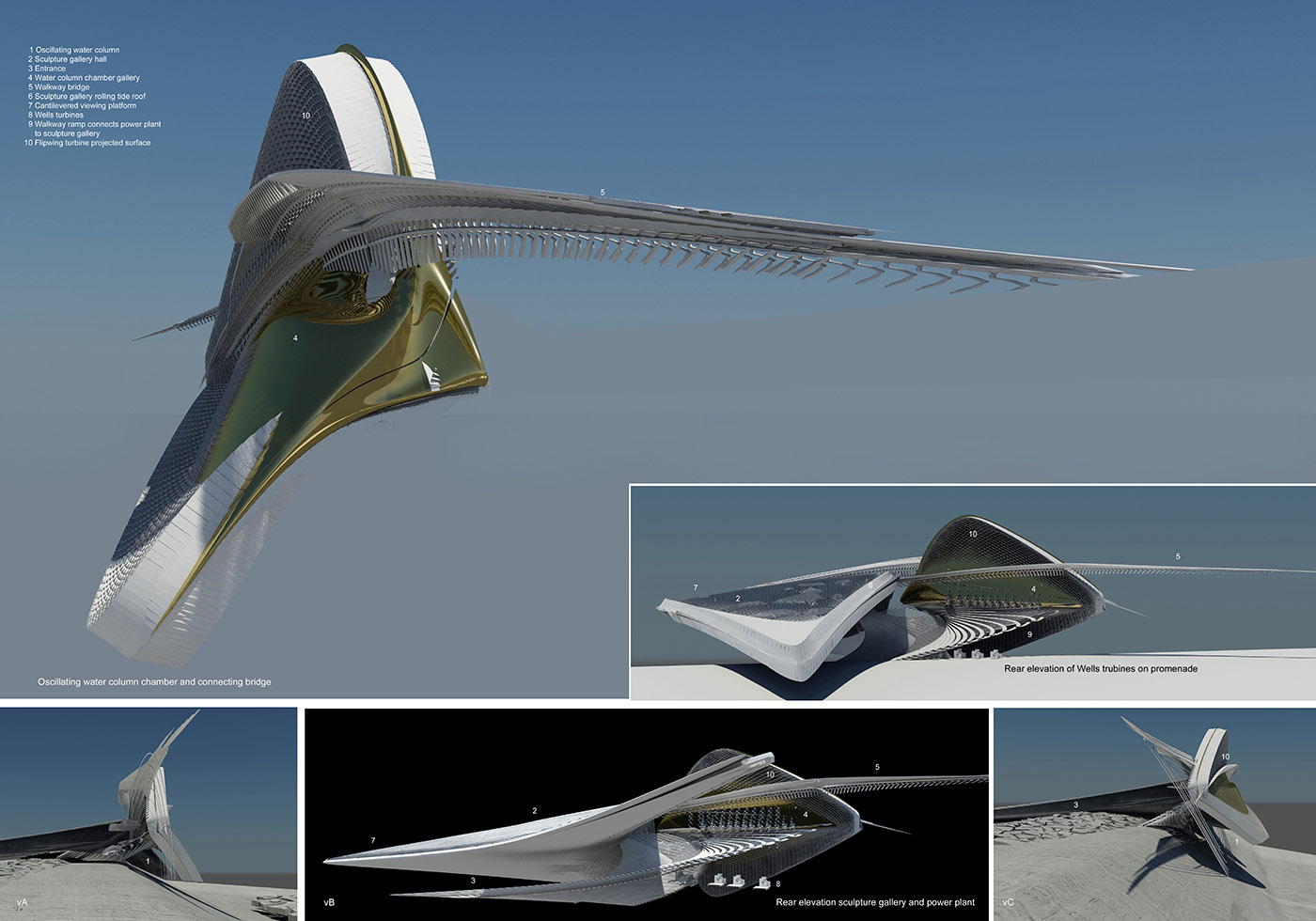 El ángulo de la galería de esculturas de la costa corresponde al ángulo de hinchamiento, que a su vez crea olas rompientes que no pierden su fuerza a medida que viajan. La arquitectura influye en las olas. Cuando la energía de las olas converge contra el elemento sobresaliente del edificio, activa la sección de la columna de agua oscilante