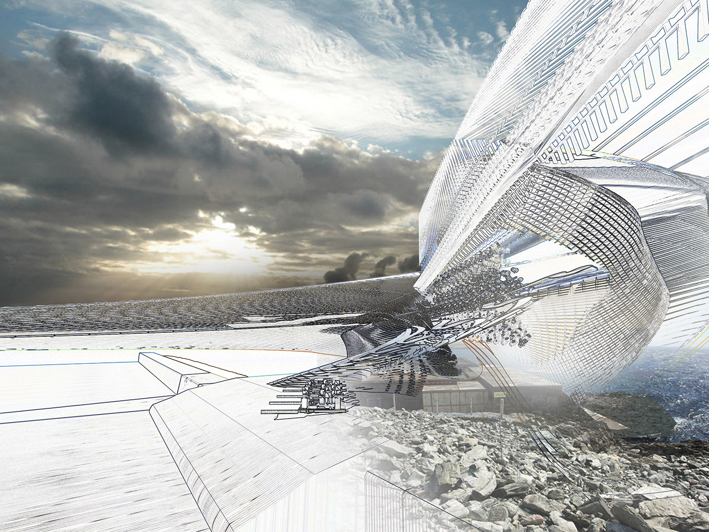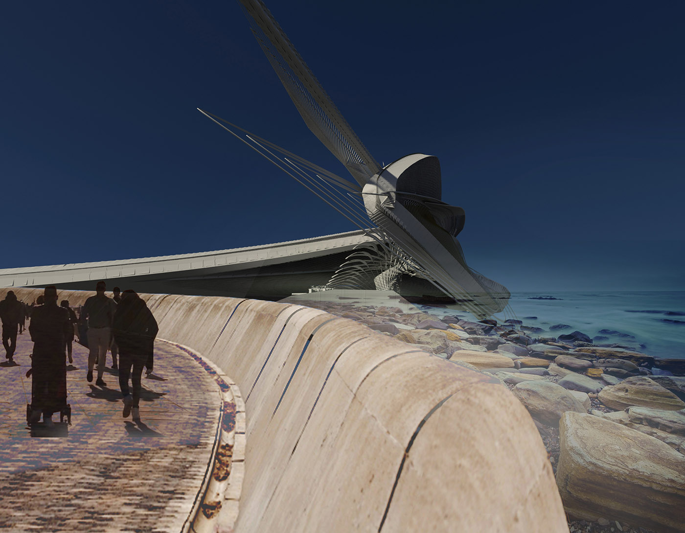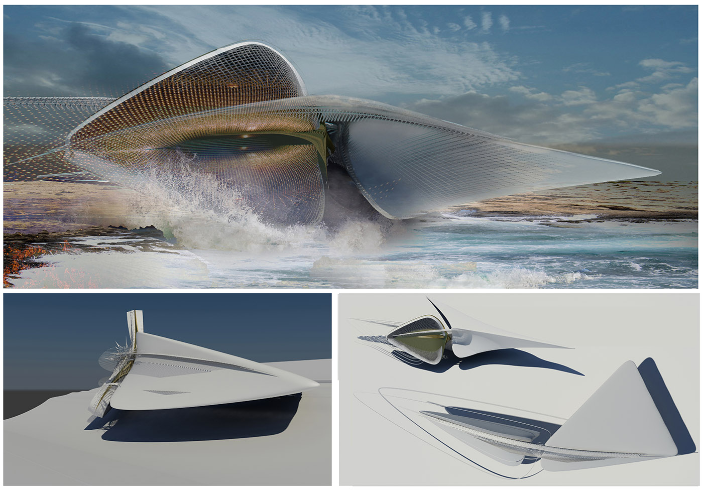 El edificio en parte en voladizo y en parte sumergido domina la costa. Inclinado a 45 grados de la costa para una exposición máxima a las olas, similar a los muelles cercanos, aumenta la generación de las olas mientras la hinchazón refracta alrededor. El elemento proyectado parcialmente sumergido está diseñado para funcionar como una columna de agua oscilante, aumentando la resistencia de las mareas al impacto con el edificio y reduciendo la erosión del suelo