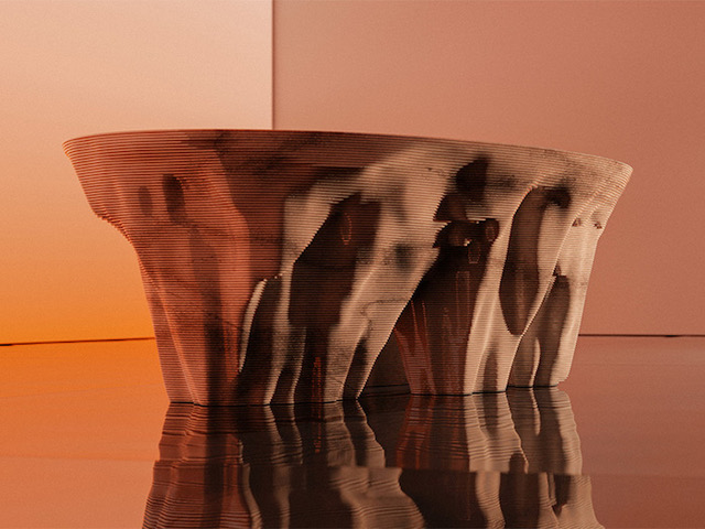 En el objeto de diseño, una serie de formas majestuosas y contorneadas surgen del suelo y se funden en una singular pieza plana de piedra tallada. "Nos inspiramos en las icónicas formaciones rocosas de arenisca de Monument Valley y en una visión americana del Oeste de Estados Unidos para una mesa de mármol en capas que se eleva desde el suelo, tallada de forma que representa un espejismo desértico del original de arenisca", afirma además Chris Duffy