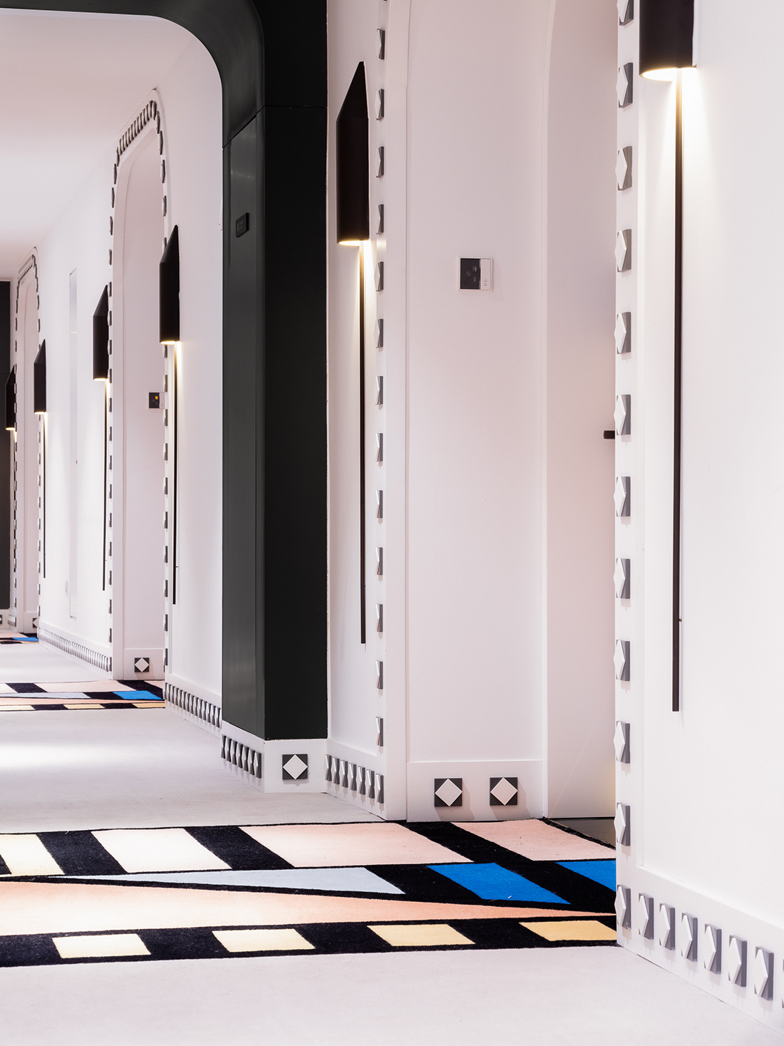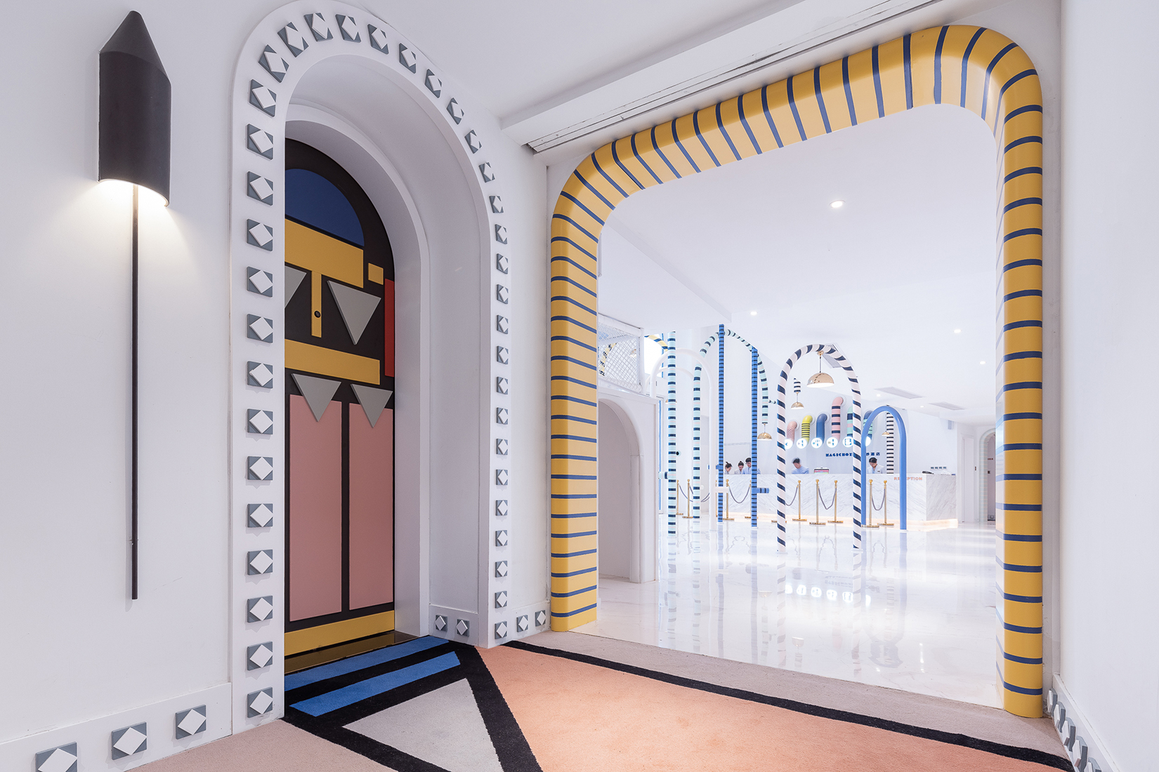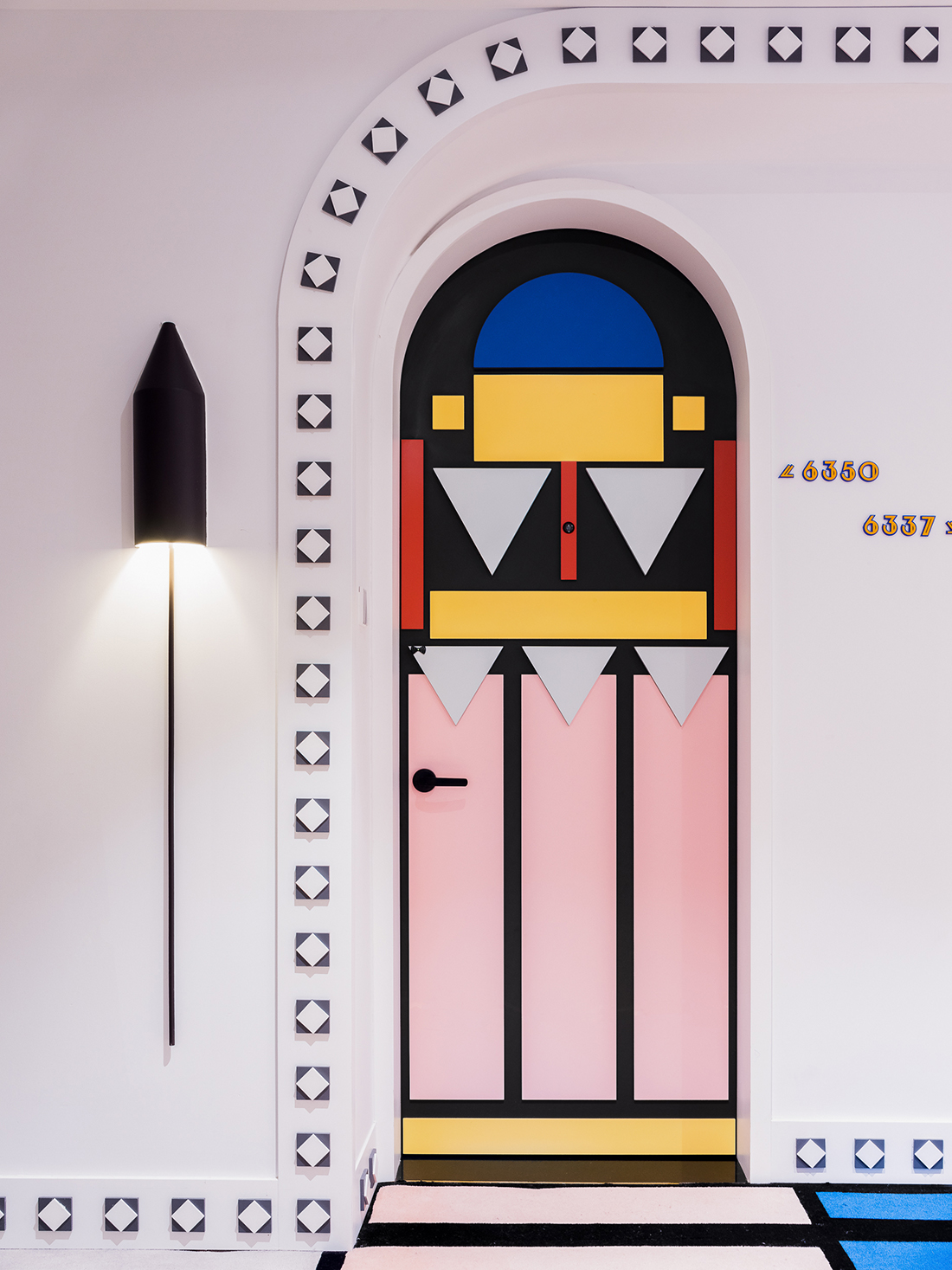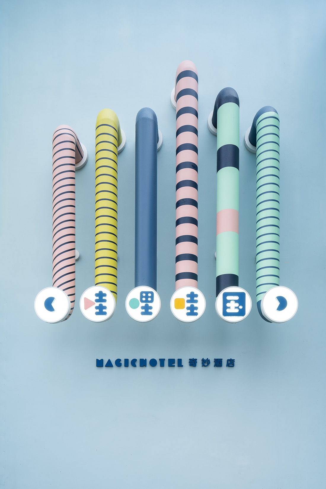Del área de vestíbulo al área de la habitación de invitados, las instalaciones de entretenimiento disminuyen gradualmente, más para el manejo del ruido y la concentración de personas. La combinación de gráficos de arco iris y altavoces separa diferentes espacios. Los colores brillantes también les recuerdan a los clientes que ingresarán a otro espacio. Los pasillos públicos crean una sensación de paraíso con colores brillantes y figuras geométricas. El estilo en las puertas de las habitaciones retoma el diseño de Menphis