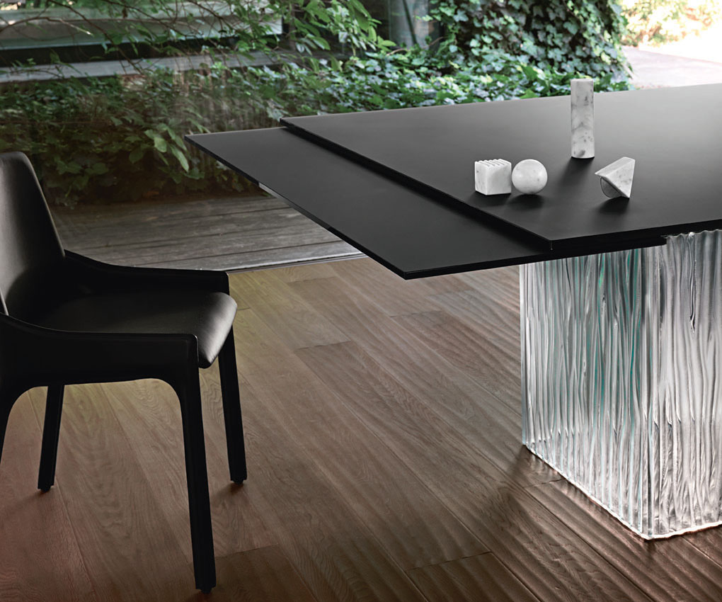 Lo studio di Architettura Bartoli Design disegna un tavolo caratterizzato dalle linee essenziali, il piano d'appoggio è estendibile, mentre il basamento è un volume anch'esso realizzato con forme essenziali